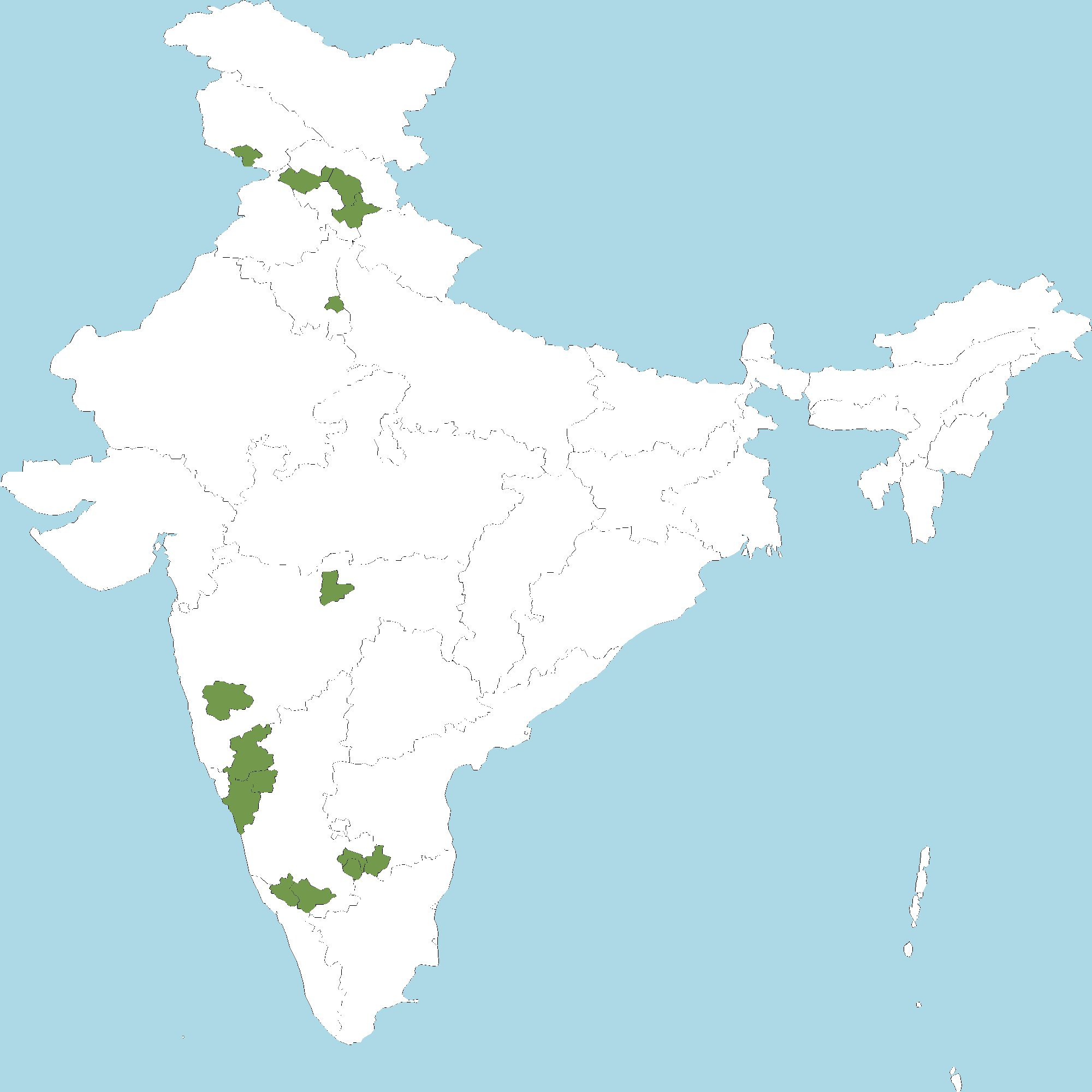- Karnataka : Bengaluru Urban district, Bengaluru Rural district, Belagavi district, Dharwad district, Kodagu (Coorg) district, Kolar district, Mysuru district, Uttara Kannada district