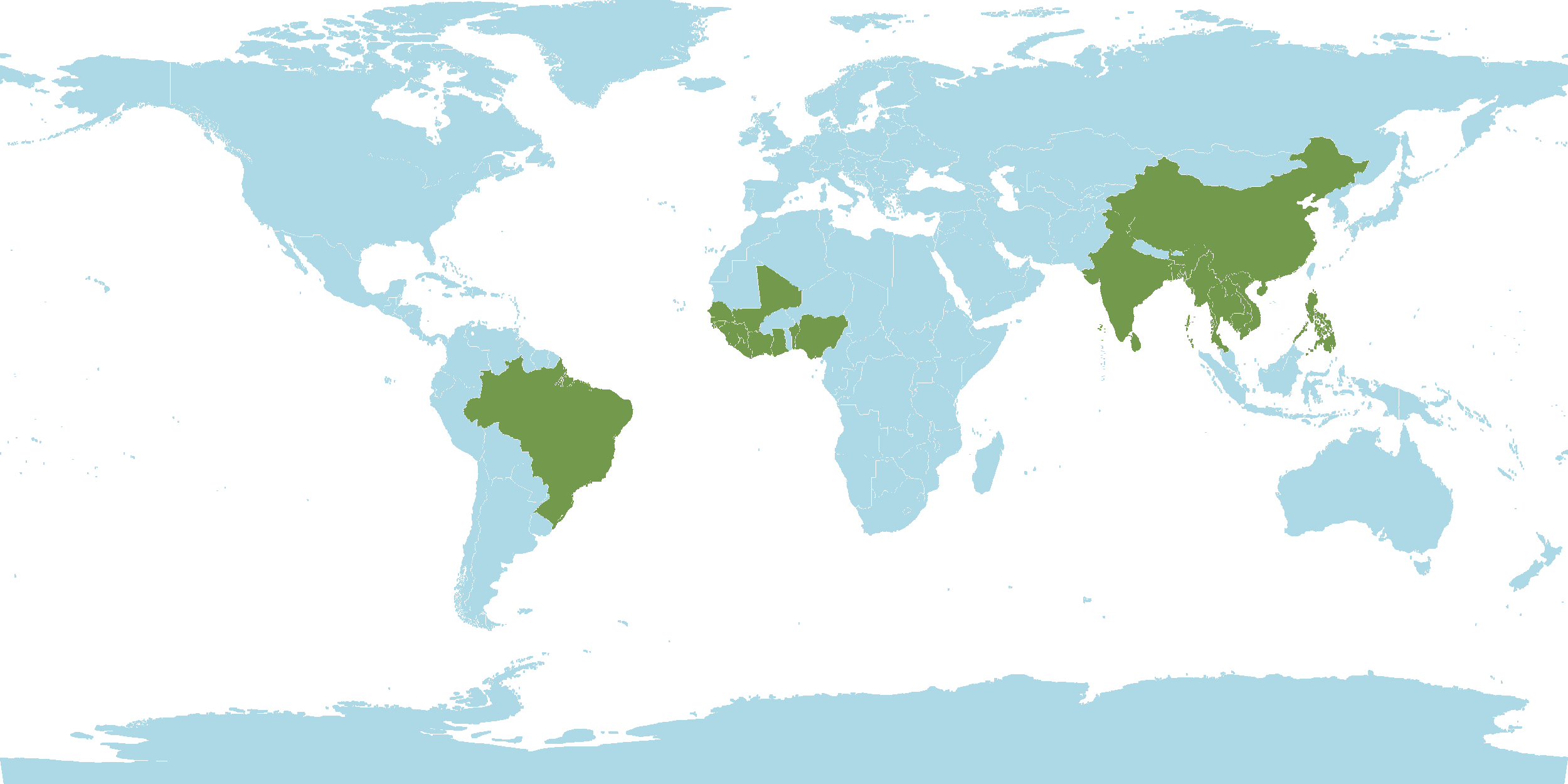 - World Distribution : Bangladesh, Benin, Borneo, Brazil, Burkina, Cambodia, China, Ghana, Guinea, Guinea-Bissau, India, Ivory Coast, Laos, Liberia, Malaya, Mali, Maluku, Myanmar, New Guinea, Nigeria, Philippines, Senegal, Sierra Leone, Sri Lanka, Sulawesi, Thailand, Vietnam, Andaman Islands