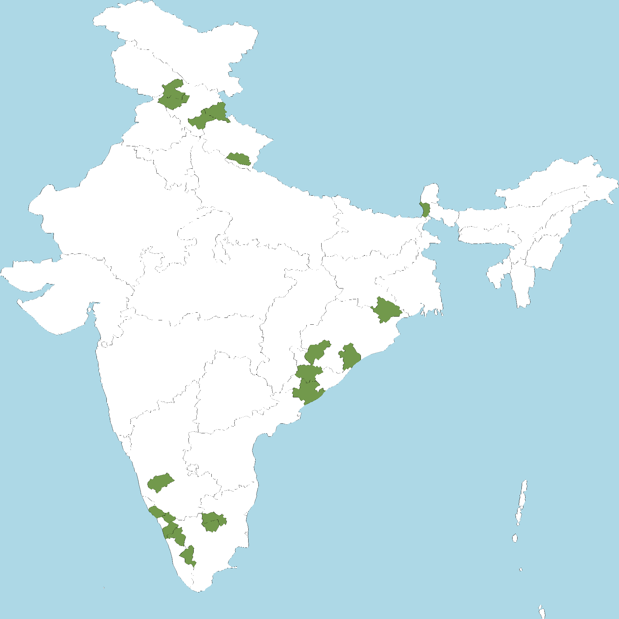 - Kerala : Kannur district, Wayanad district, Malappuram district, Palakkad district, Idukki district