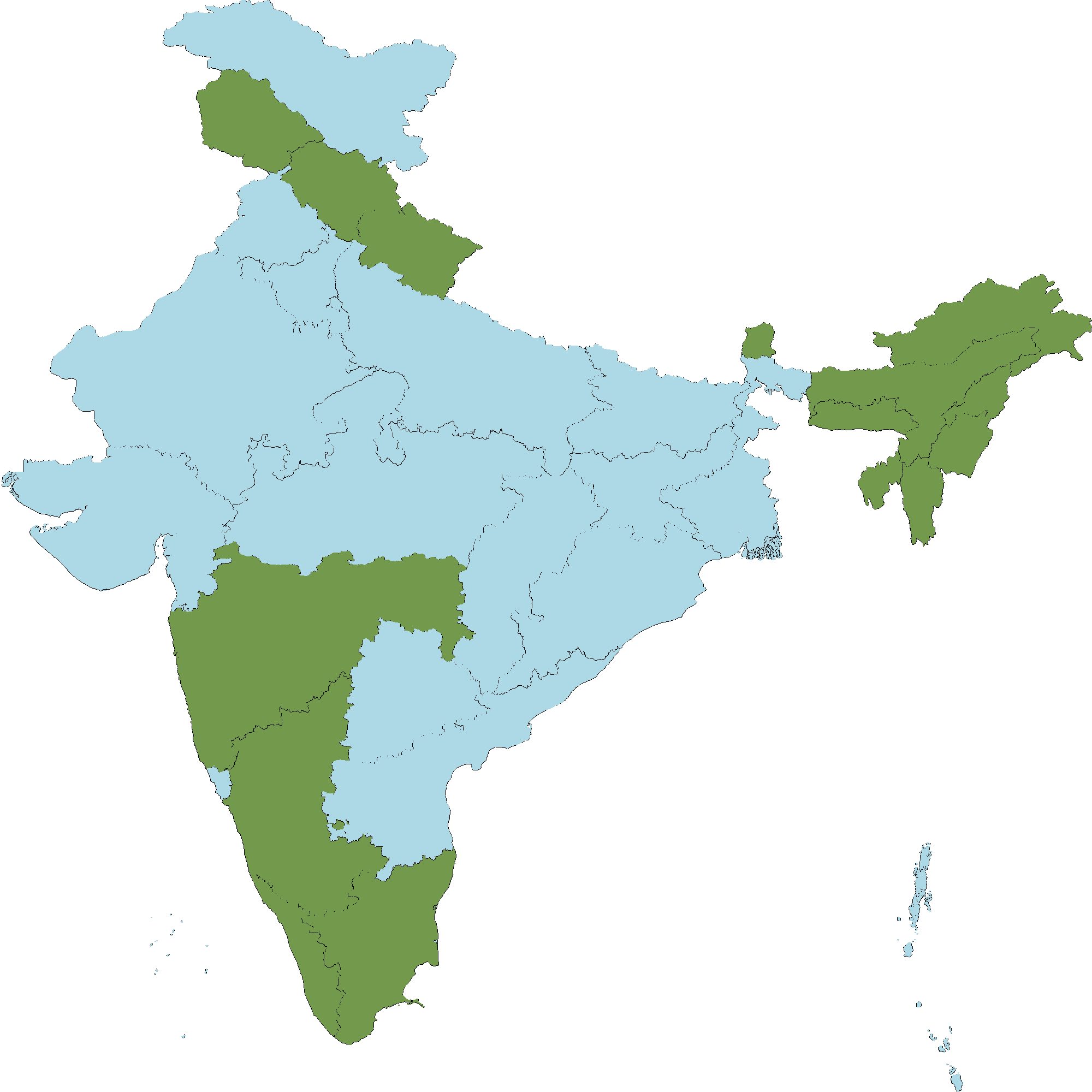 - Kerala : Kannur district, Wayanad district, Palakkad district, Idukki district, Kottayam district, Pathanamthitta district, Thiruvananthapuram district