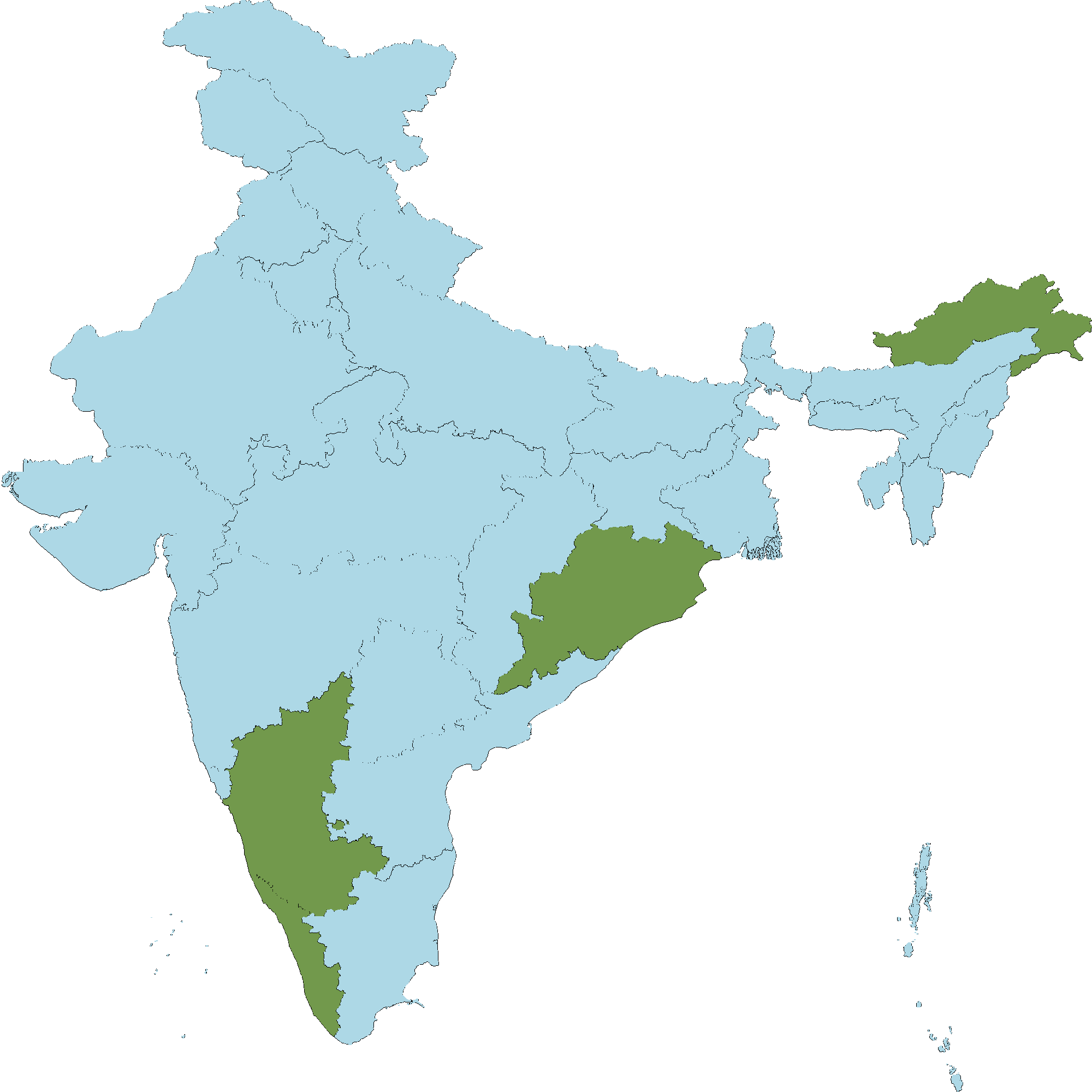 - Kerala : Kannur district, Wayanad district, Kozhikode district, Malappuram district, Palakkad district, Thrissur district, Idukki district, Kottayam district, Pathanamthitta district, Kollam district, Thiruvananthapuram district