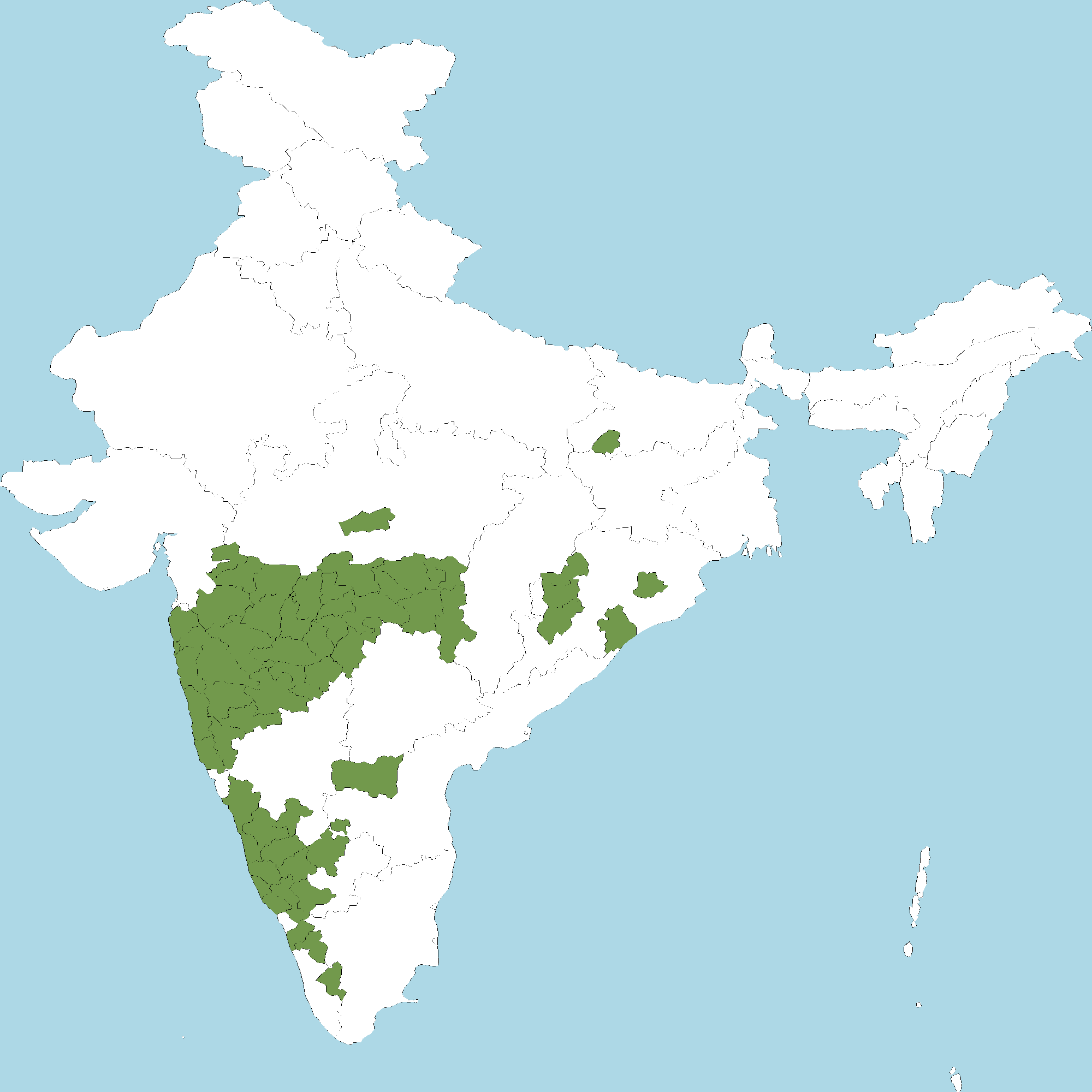 - Karnataka : Chikkamagaluru district, Dakshina Kannada district, Davanagere district, Hassan district, Kodagu (Coorg) district, Mysuru district, Shivamogga district, Tumakuru district, Udupi district, Uttara Kannada district