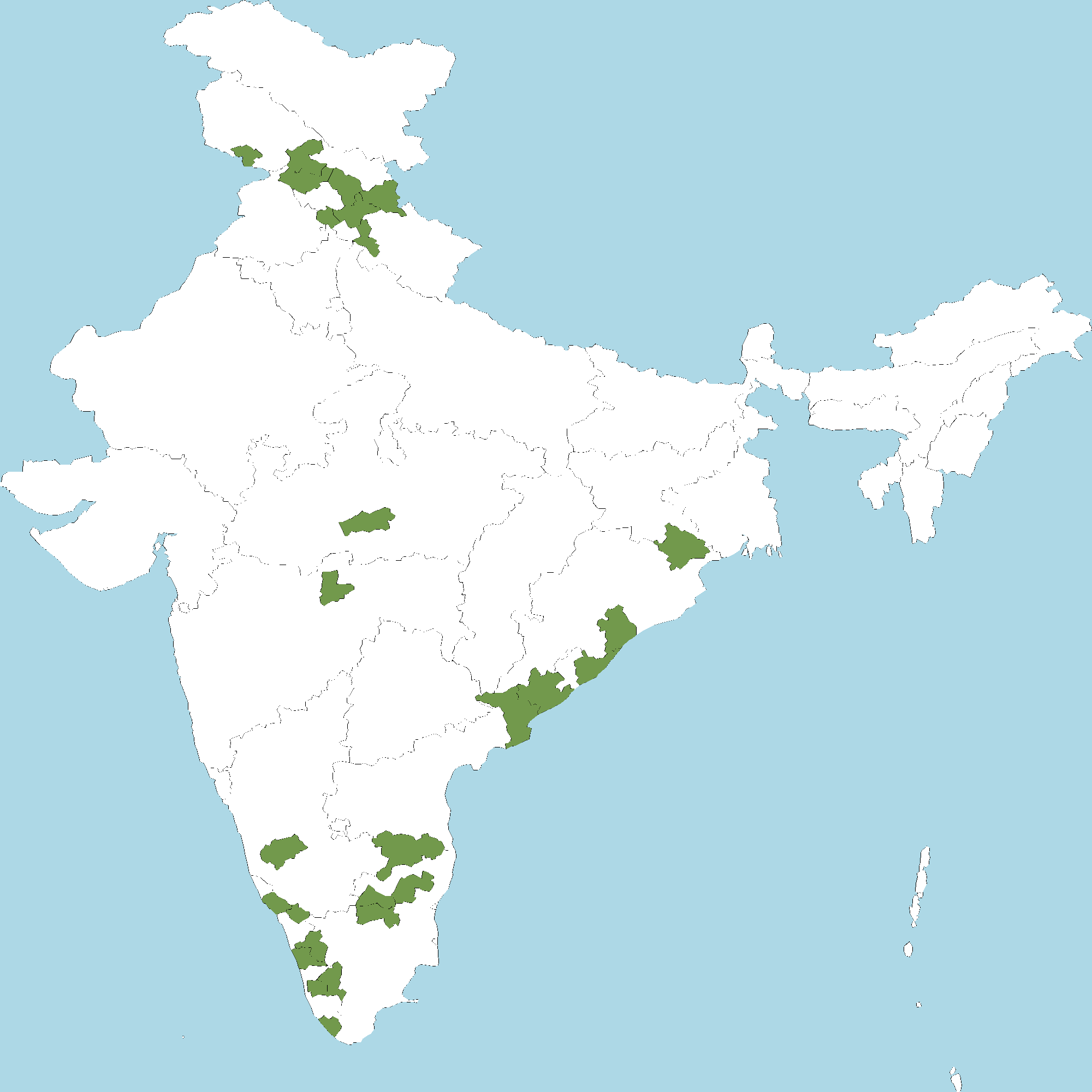 - Kerala : Kannur district, Wayanad district, Palakkad district, Thrissur district, Idukki district, Kottayam district, Thiruvananthapuram district