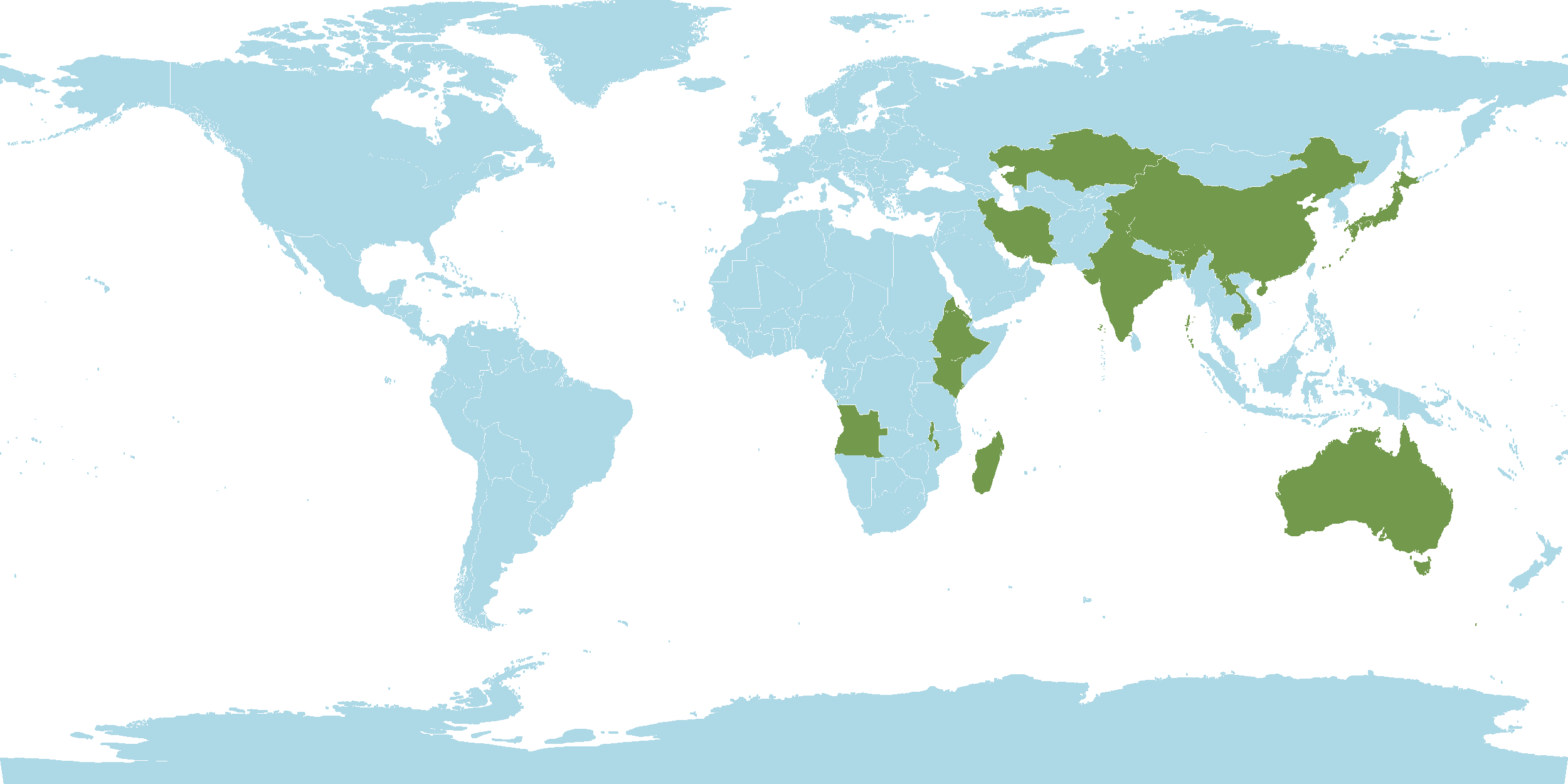 - Native : Amur, Angola, Australia, Bhutan, Borneo, Cambodia, China, Eritrea, Ethiopia, Hainan, India, Inner Mongolia, Iran, Japan, Jawa, Kazakhstan, Kenya, Khabarovsk, Kirgizstan, Korea, Laos, Lesser Sunda Islands, Madagascar, Malawi, Malaya, Maluku, Manchuria, Mau