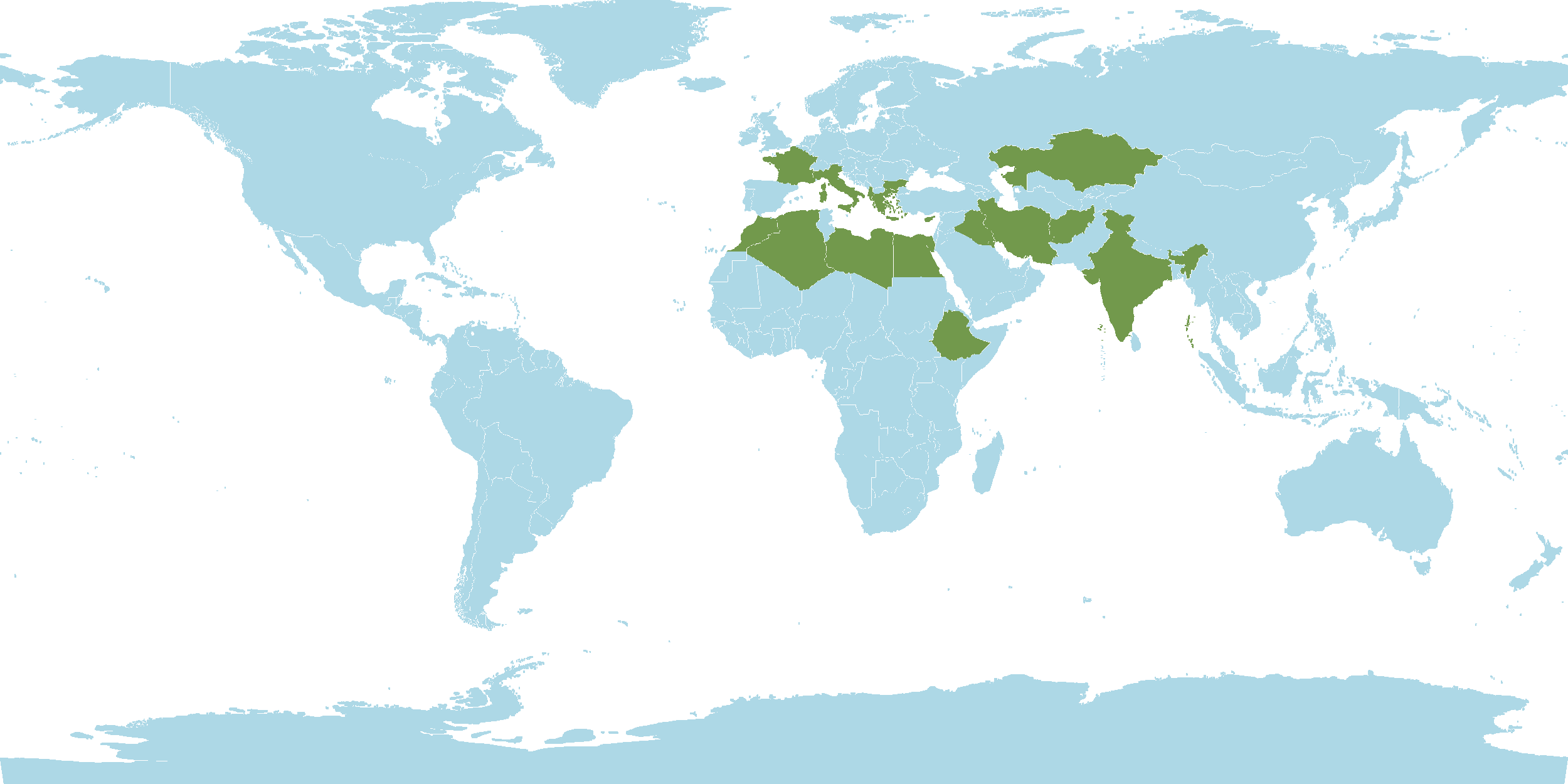 - Native : Afghanistan, Albania, Algeria, Azores, Baleares, Bulgaria, Canary Islands, Corse, Cyprus, East Aegean Islands, Egypt, Ethiopia, France, Greece, Gulf States, India, Iran, Iraq, Italy, Kazakhstan, Kriti, Kuwait, Lebanon-Syria, Libya, Madeira, Morocco, North