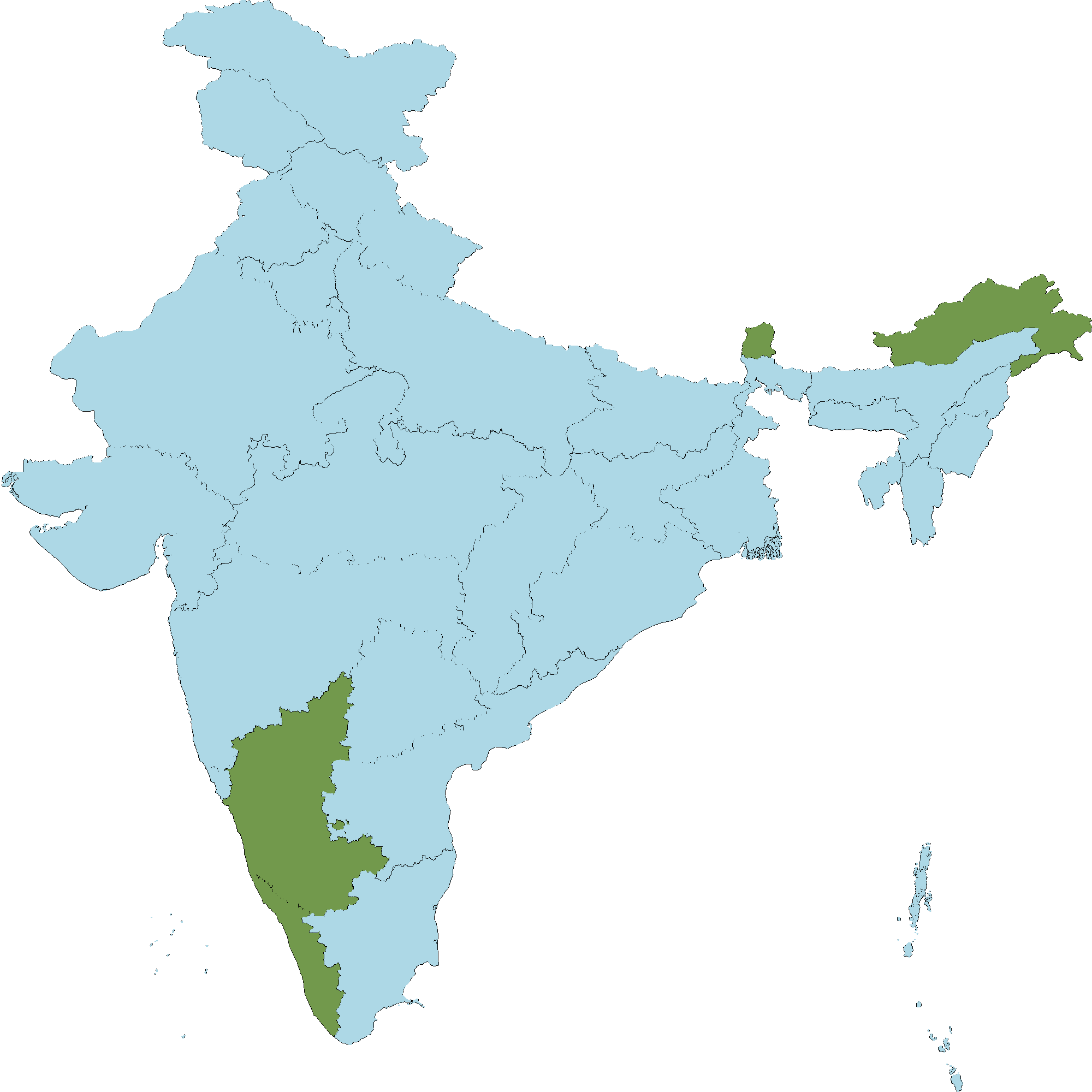 • Kerala : Wayanad district, Palakkad district, Idukki district, Kollam district, Thiruvananthapuram district, Kasaragod district
