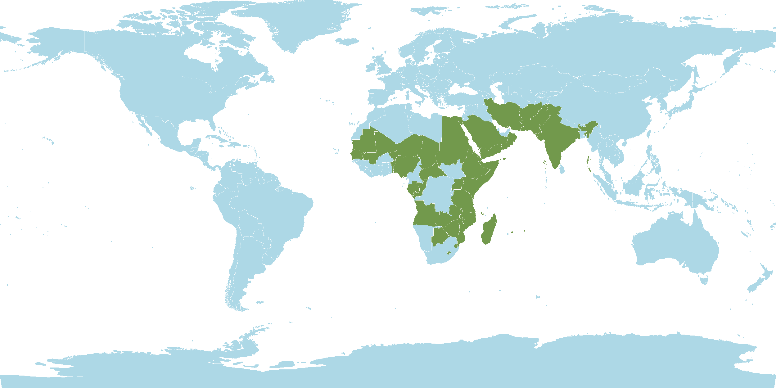 - World Distribution : Afghanistan, Angola, Benin, Botswana, Burkina, Cape Provinces, Central African Republic, Chad, Comoros, Congo, Djibouti, Egypt, Eritrea, Ethiopia, Free State, Gabon, Gulf States, India, Iran, Kenya, KwaZulu-Natal, Lesotho, Madagascar, Malawi, Mali, Mauritania, Mauritius, Mozambique, Niger, Nigeria, Northern Provinces, Oman, Pakistan, Palestine, Saudi Arabia, Senegal, Socotra, Somalia, Sudan, Swaziland, Tanzania, Uganda, Yemen, Zambia, Zaïre, Zimbabwe