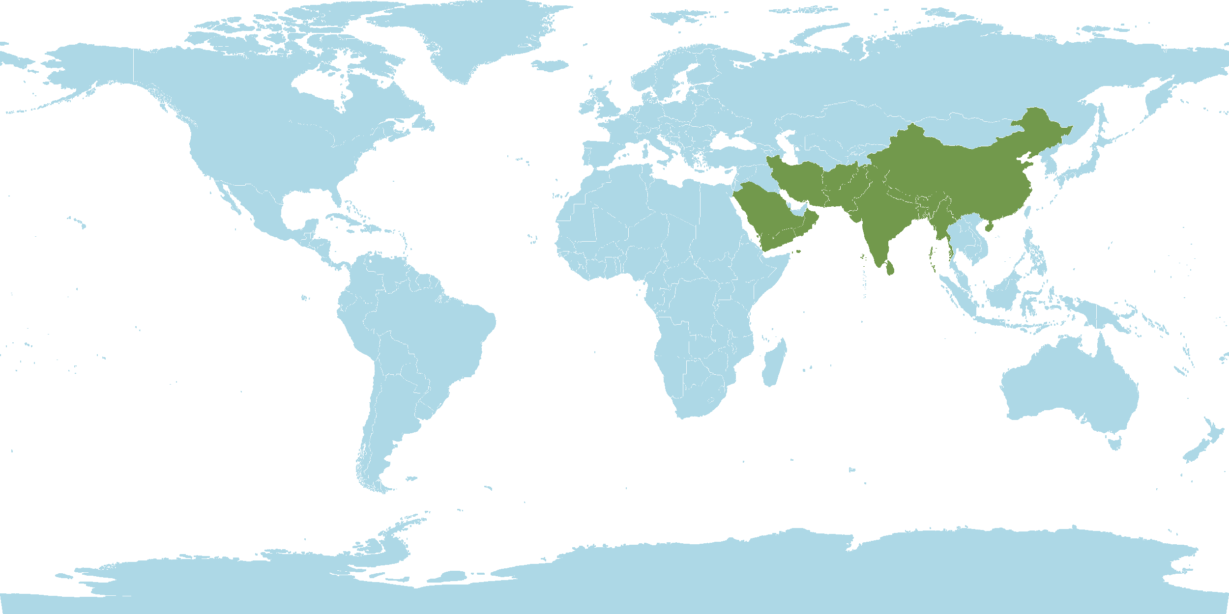 - World Distribution : Afghanistan, Andaman Islands, Bangladesh, Bhutan, China, Gulf States, India, Iran, Myanmar, Nepal, Oman, Pakistan, Saudi Arabia, Sri Lanka, Yemen