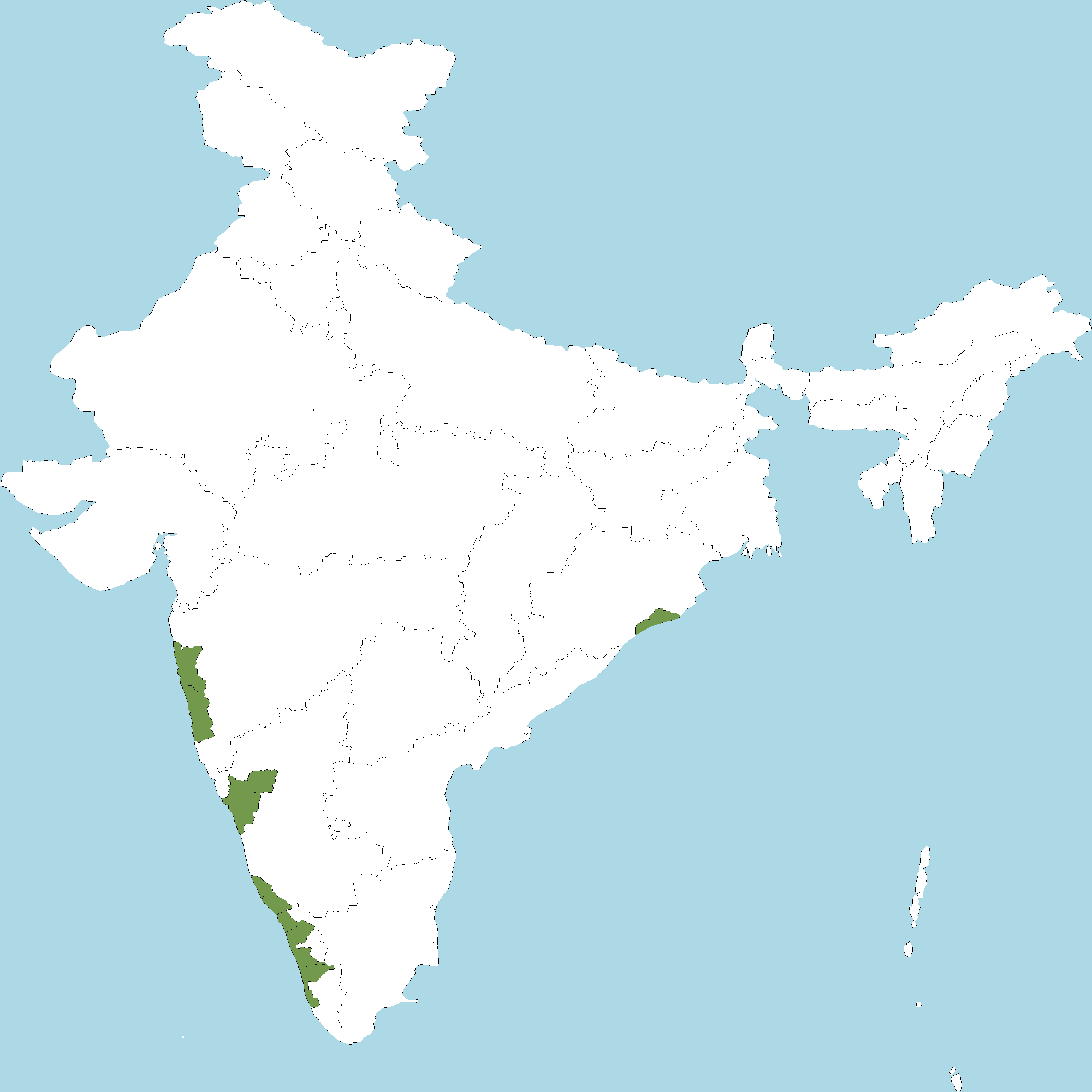 - Kerala : Kasaragod district, Kannur district, Kozhikode district, Malappuram district, Thrissur district, Ernakulam district, Alappuzha district