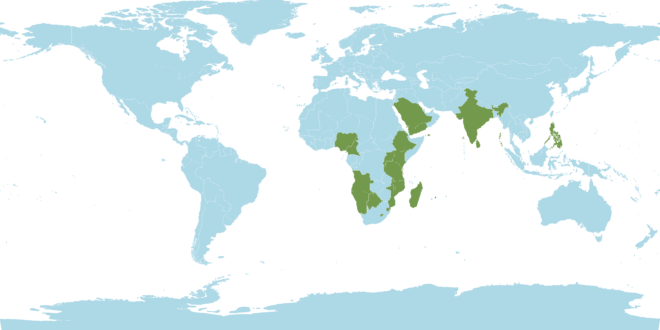 - Native : Angola, Botswana, Burundi, Cameroon, Cape Provinces, Ethiopia, Free State, Gulf of Guinea Is., Kenya, KwaZulu-Natal, Lesotho, Malawi, Mozambique, Namibia, Nigeria, Northern Provinces, Rwanda, Saudi Arabia, Sri Lanka, Swaziland, Tanzania, Uganda, Yemen, Za
