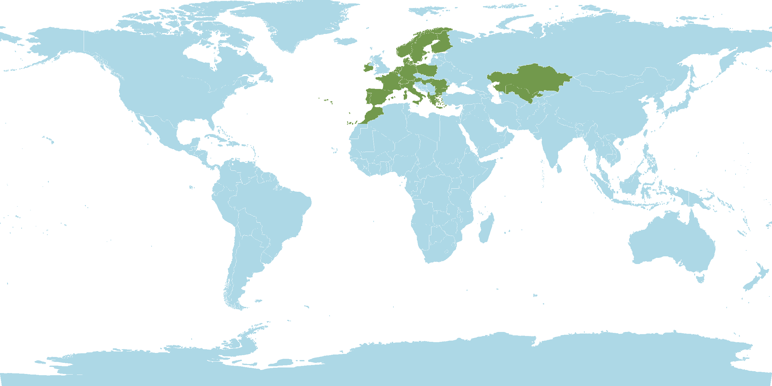 - World Distribution : Albania, Altay, Austria, Baltic States, Belgium, Bulgaria, Central European Russia, Corse, Czechoslovakia, Denmark, Finland, France, Føroyar, Germany, Great Britain, Greece, Hungary, Ireland, Italy, Kazakhstan, Madeira, Morocco, Netherlands, North European Russia, Northwest European Russia, Norway, Poland, Portugal, Romania, South European Russia, Spain, Sweden, Switzerland, Tadzhikistan, Transcaucasus, Uzbekistan, West Siberia, Yugoslavia