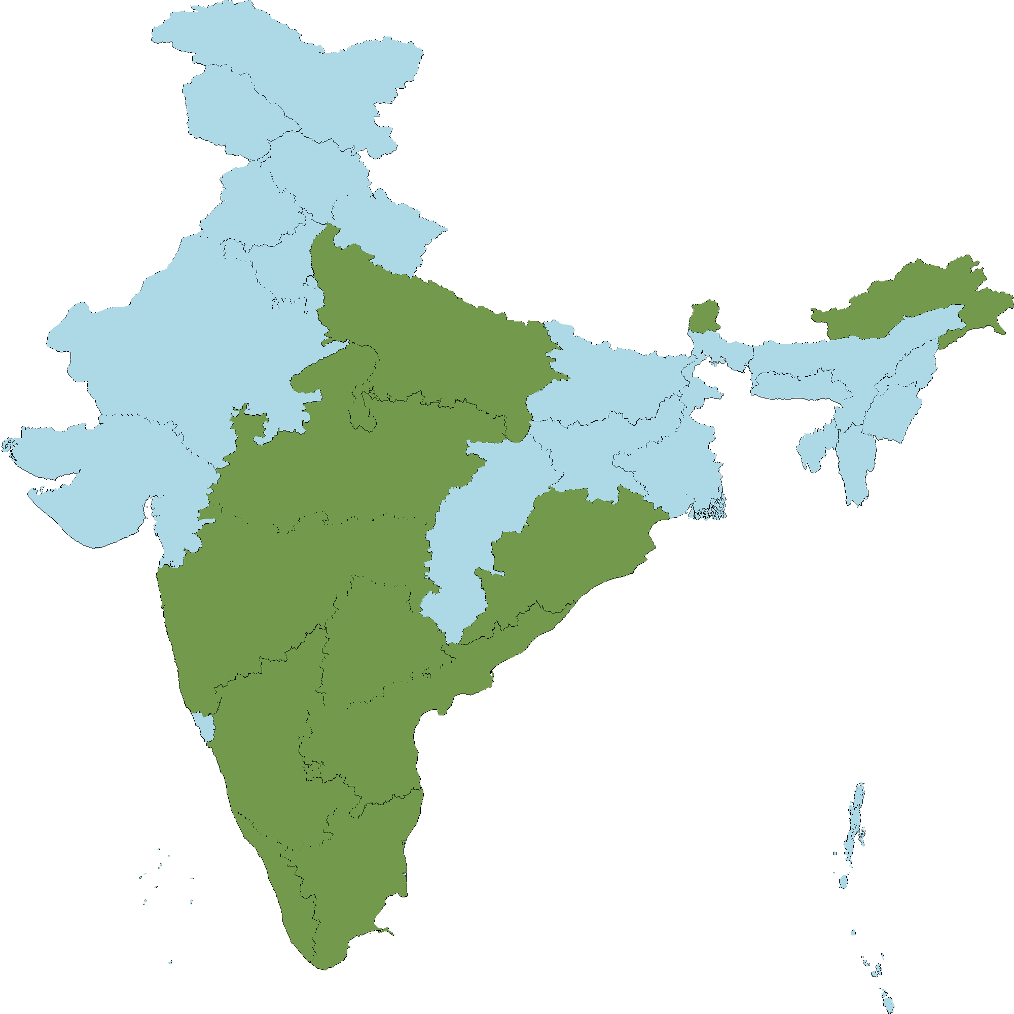 - Tamil Nadu : Coimbatore district, Dharmapuri district, Dindigul district, Kanyakumari district, Madurai district, Namakkal district, The Nilgiri district, Salem district, Tirunelveli district, Tiruvannamalai district, Vellore district, Villipuram district, Virudhunagar district