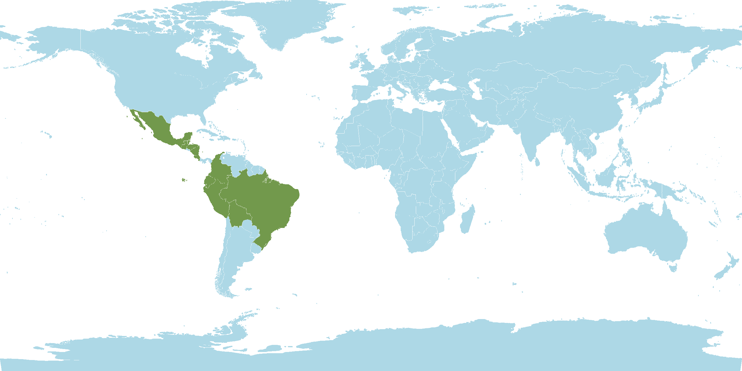 - World Distribution : Belize, Bolivia, Brazil, Colombia, Costa Rica, Ecuador, Guatemala, Honduras, Mexico, Nicaragua, Panamá, Peru