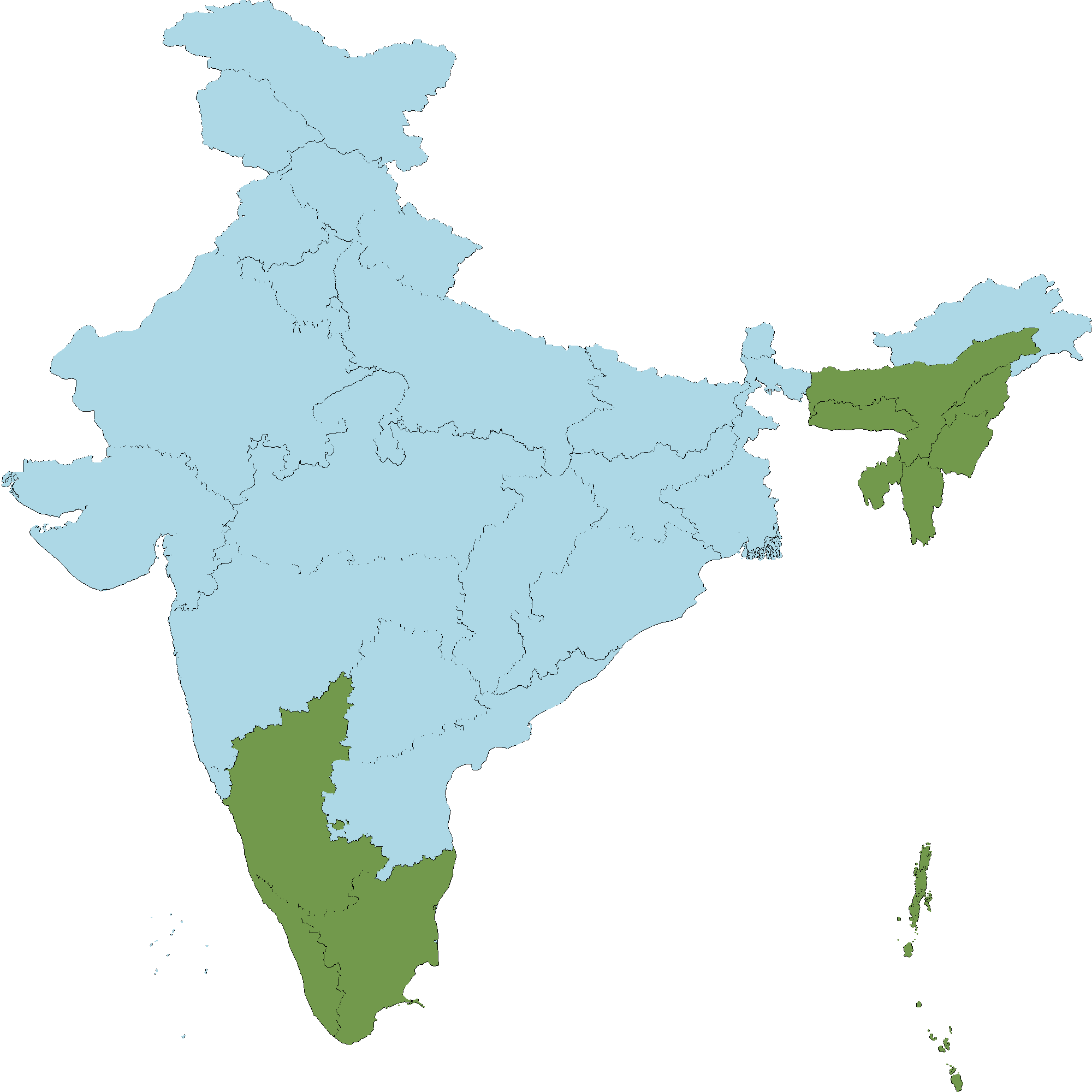 Karnataka : Hassan district, Shivamogga district, Kodagu (Coorg) district, Udupi district, Davanagare district  Kerala : Kannur district, Wayanad district, Kozhikode district, Kottayam district, Alappuzha district, Pathanamthitta district, Kollam district, Thiruvananthapuram district  Tamil Nadu : The Nilgiri district, Salem district, Theni district, Tirunelveli district  Meghalaya : Meghalaya  Assam : Assam  Nagaland : Nagaland  Mizoram : Mizoram  Andaman and Nicobar Islands : Andaman Islands  Manipur : Manipur  Tripura : Tripura