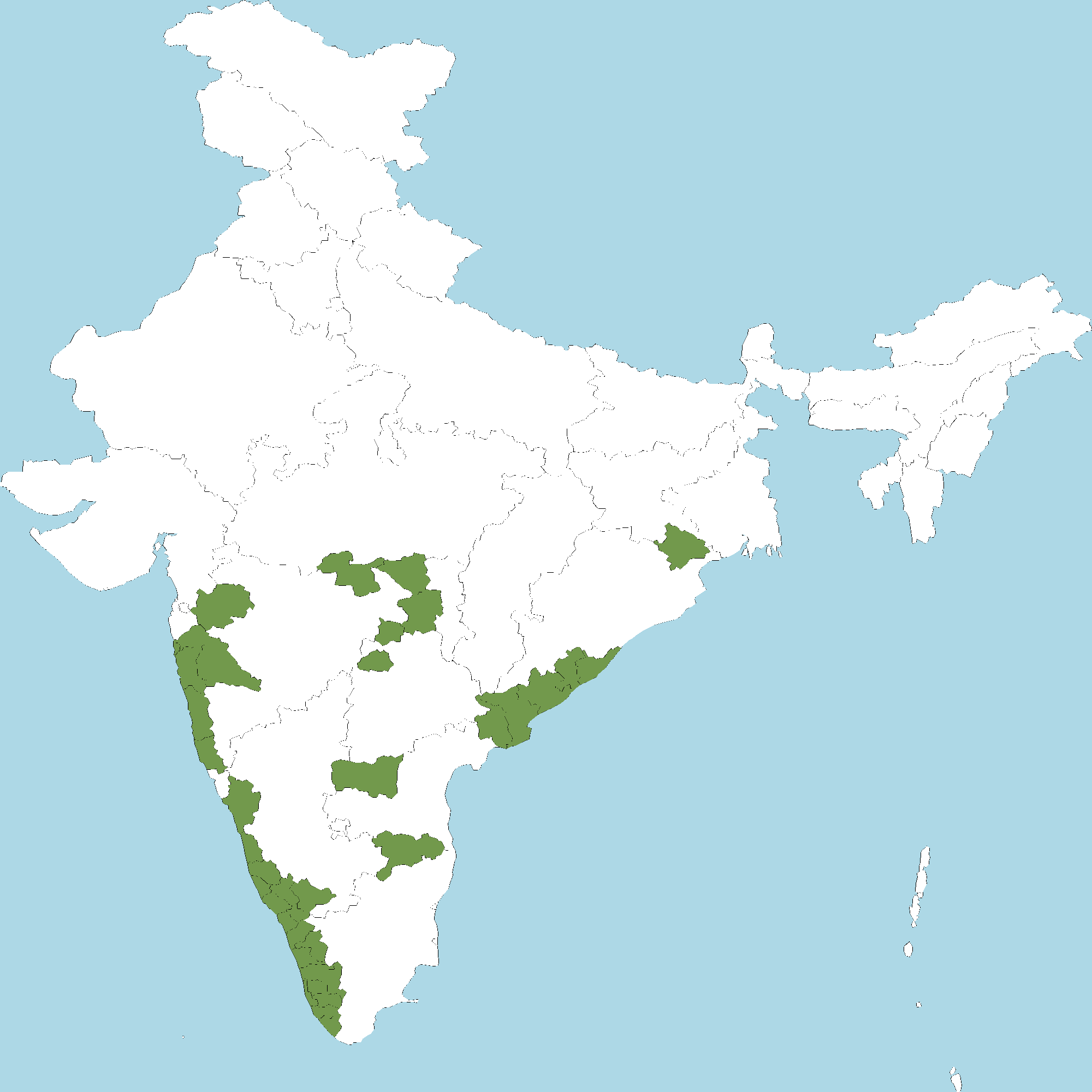 - Karnataka : Mysuru district, Udupi district, Uttara Kannada district, Dakshina Kannada district, Kodagu (Coorg) district