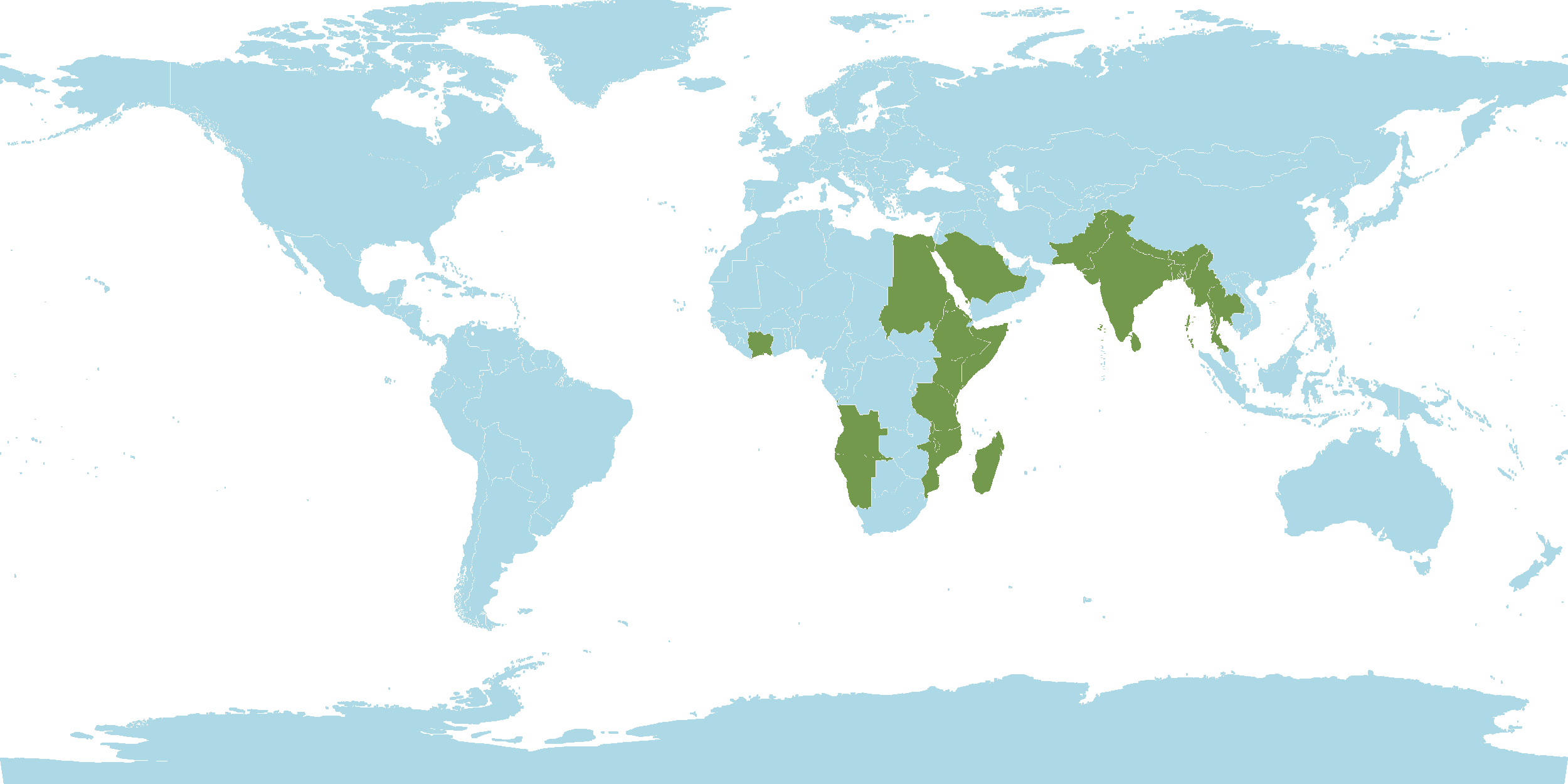- Native : Angola, Bangladesh, Bhutan, Egypt, Eritrea, Ethiopia, India, Ivory Coast, Jawa, Kenya, Lesser Sunda Islands, Madagascar, Malawi, Mozambique, Myanmar, Namibia, Nepal, Northern Provinces, Pakistan, Saudi Arabia, Somalia, Sri Lanka, Sudan, Tanzania, Thailand