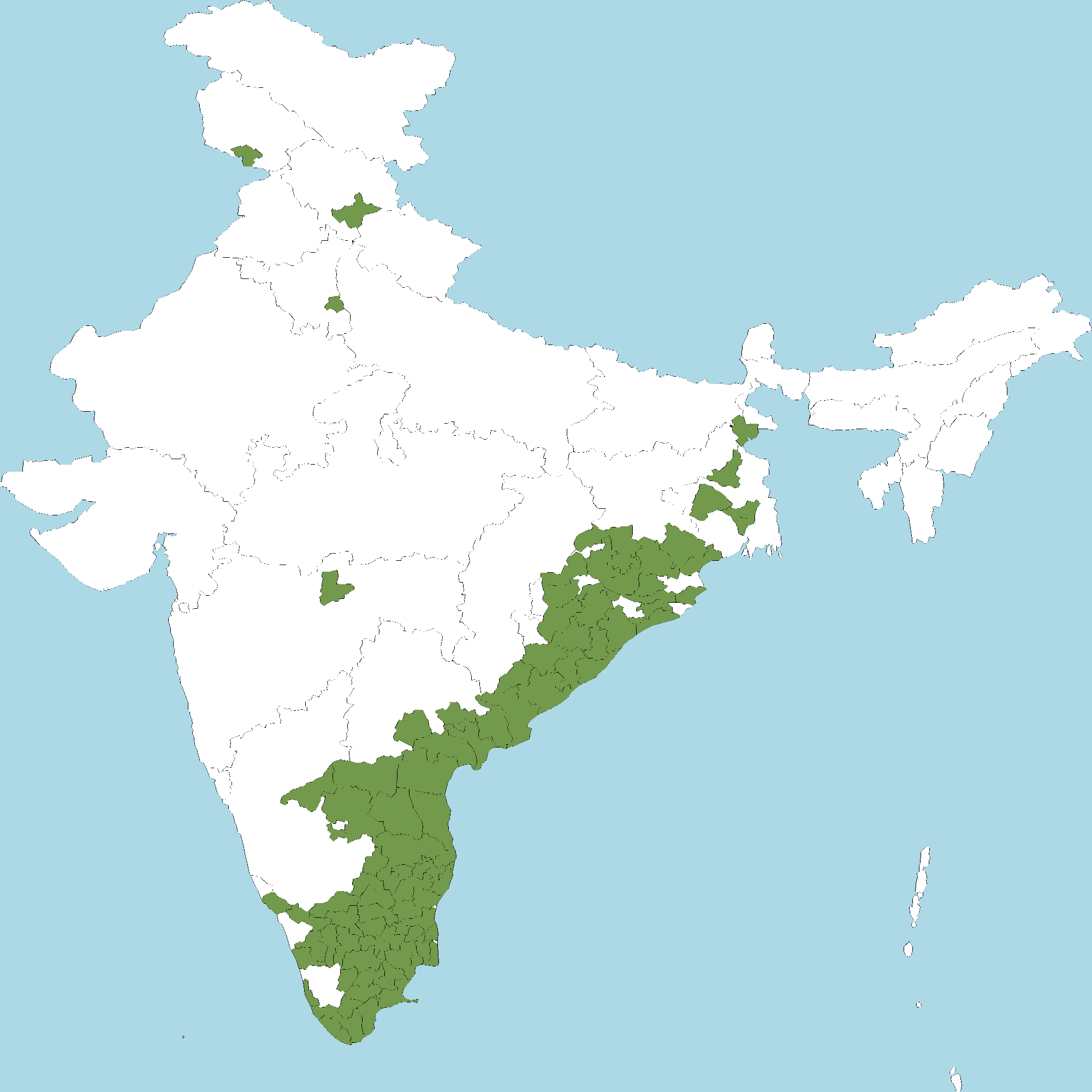 - Andhra Pradesh : Anantapur district, Chittoor district, Y.S.R. Kadapa district, East Godavari district, Guntur district, Krishna district, Kurnool district, S.P.S. Nellore district, Prakasam district, Srikakulam district, Visakhapatnam district, Vizianagaram district, West Godavari district