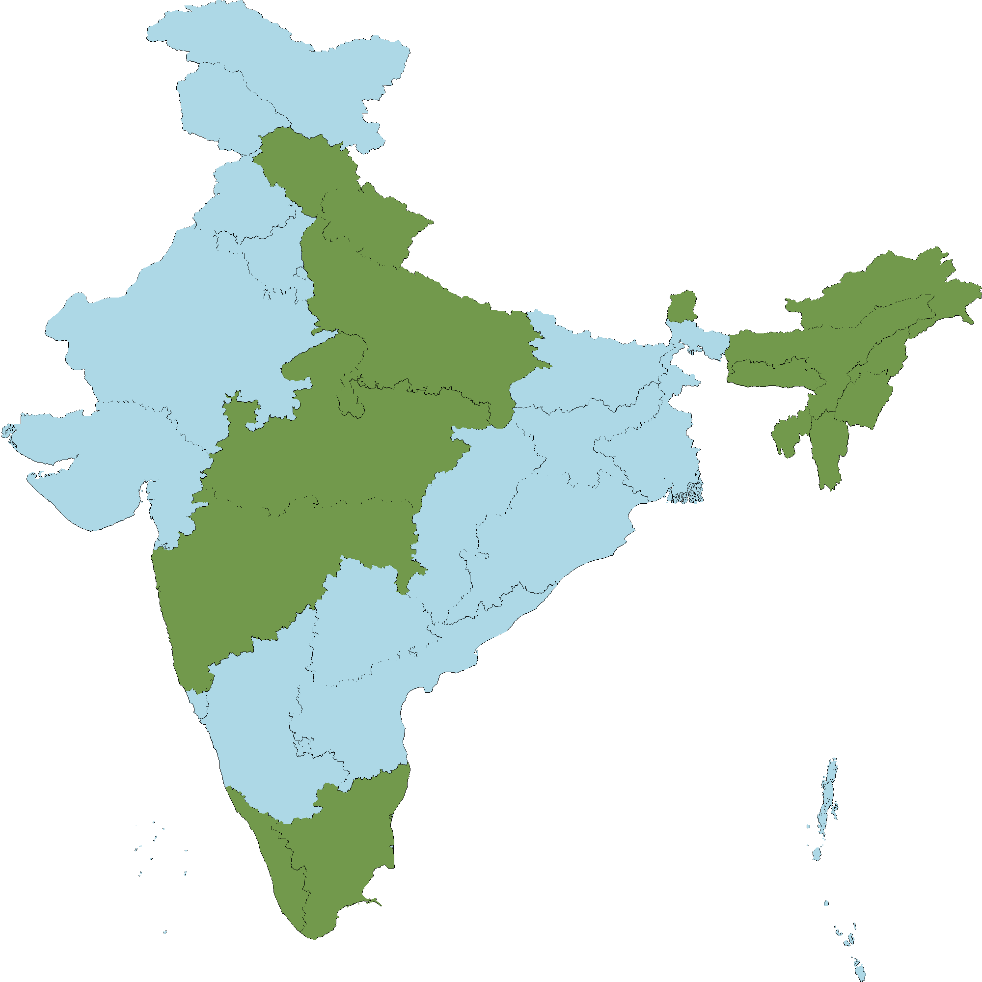 - Kerala : Kasaragod district, Kannur district, Wayanad district, Kozhikode district, Malappuram district, Palakkad district, Thrissur district, Idukki district, Pathanamthitta district, Kollam district, Thiruvananthapuram district