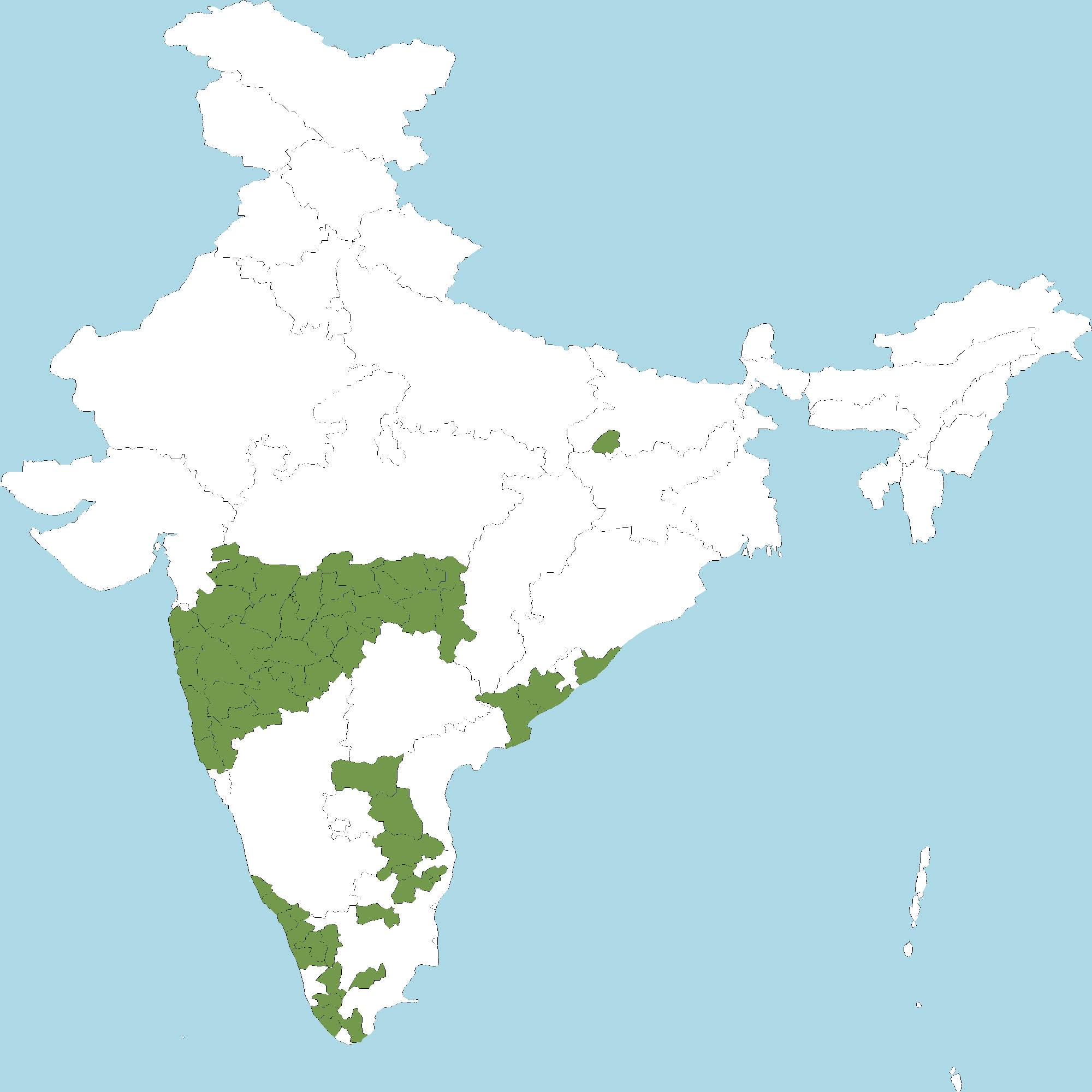 - Kerala : Kasaragod district, Kannur district, Wayanad district, Kozhikode district, Malappuram district, Palakkad district, Thrissur district, Idukki district, Pathanamthitta district, Kollam district, Thiruvananthapuram district