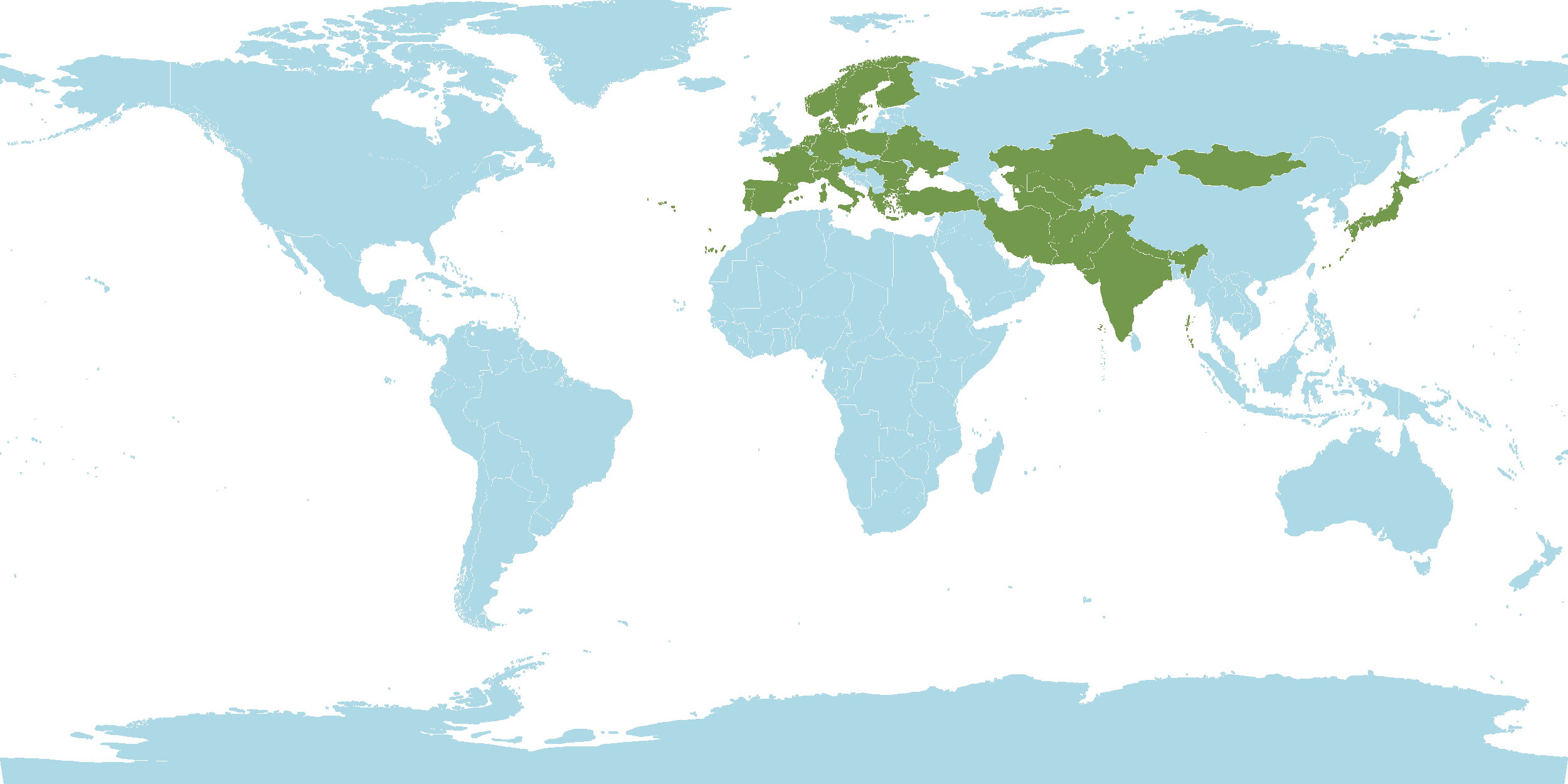 - World Distribution : Afghanistan, Albania, Altay, Amur, Austria, Baleares, Baltic States, Belarus, Belgium, Bhutan, Bulgaria, Buryatiya, Central European Russia, China North-Central, China South-Central, China Southeast, Chita, Czechoslovakia, Denmark, East European Russia, Finland, France, Germany, Greece, Hungary, India, Inner Mongolia, Iran, Irkutsk, Italy, Japan, Kamchatka, Kazakhstan, Khabarovsk, Kirgizstan, Krasnoyarsk, Krym, Magadan, Manchuria, Mongolia, Nansei-shoto, Nepal, Netherlands, North Caucasus, North European Russia, Northwest European Russia, Norway, Pakistan, Palestine, Poland, Portugal, Primorye, Qinghai, Romania, Sakhalin, South European Russia, Spain, Sweden, Switzerland, Tadzhikistan, Tibet, Transcaucasus, Turkey, Turkey-in-Europe, Turkmenistan, Tuva, Ukraine, Uzbekistan, West Siberia, Xinjiang, Yakutskiya, Yugoslavia