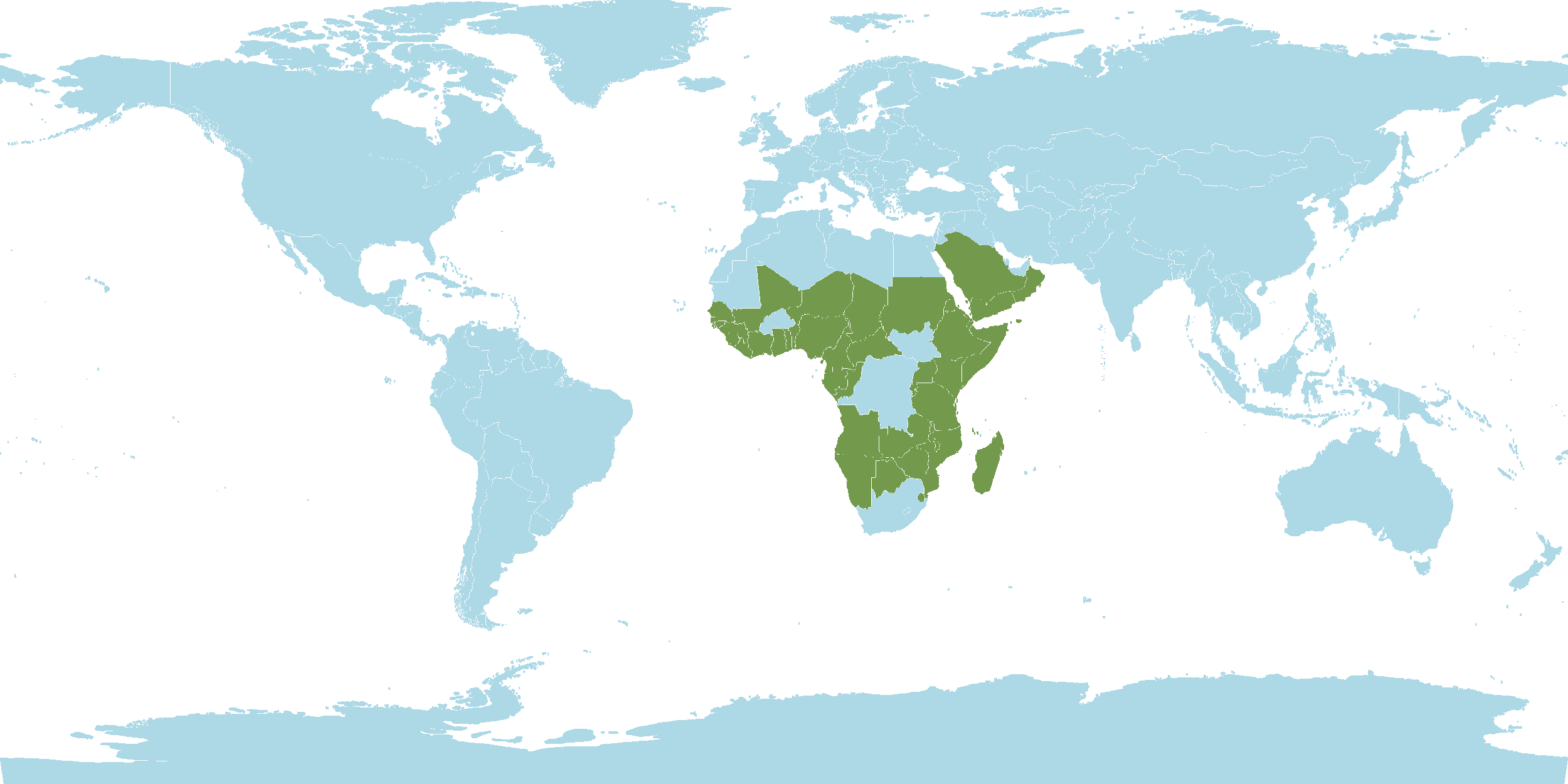- World Distribution : Angola, Benin, Botswana, Burkina, Burundi, Cameroon, Cape Provinces, Caprivi Strip, Central African Republic, Chad, Comoros, Congo, Djibouti, Equatorial Guinea, Eritrea, Ethiopia, Gabon, Gambia, Ghana, Guinea, Guinea-Bissau, Gulf of Guinea Islands, Ivory Coast, Kenya, KwaZulu-Natal, Liberia, Madagascar, Malawi, Mali, Mozambique, Namibia, Niger, Nigeria, Northern Provinces, Oman, Rwanda, Saudi Arabia, Senegal, Sierra Leone, Socotra, Somalia, Sudan, Swaziland, Tanzania, Togo, Uganda, Yemen, Zambia, Zaïre, Zimbabwe