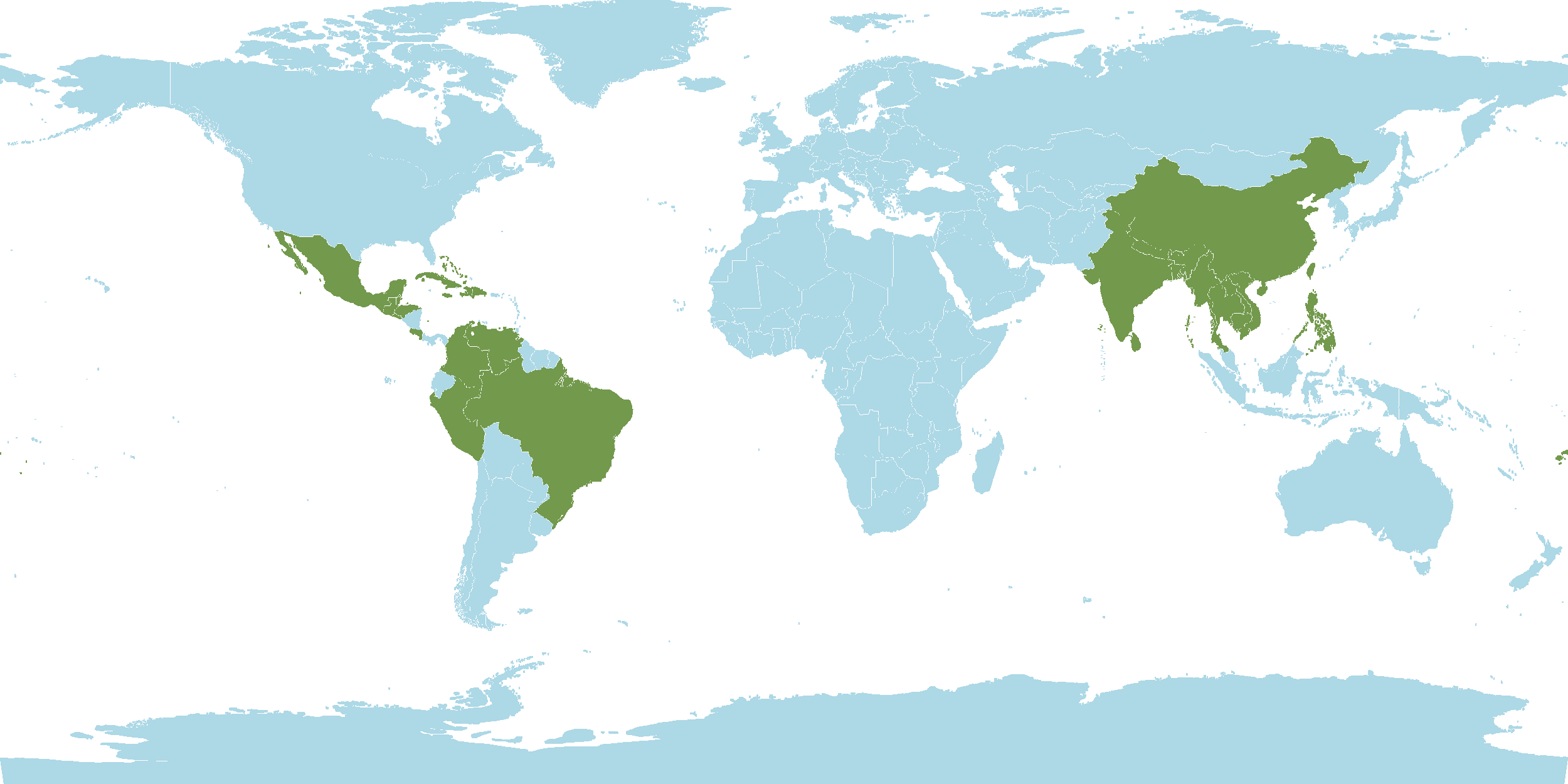 - World Distribution : Andaman Islands, Bangladesh, Bhutan, Cambodia, China, Hainan, India, Laos, Myanmar, Nepal, Philippines, Sri Lanka, Thailand, Vietnam, Bahamas, Belize, Brazil, Colombia, Cook Islands, Costa Rica, Cuba, Dominican Republic, El Salvador, Fiji, Florida, Galápagos, Guatemala, Haiti, Hawaii, Honduras, Jamaica, Leeward Islands, Marquesas, Mexico, Niue, Panamá, Peru, Puerto Rico, Society Islands, Southwest Caribbean, Taiwan, Tonga, Trinidad-Tobago, Venezuela, Windward Islands