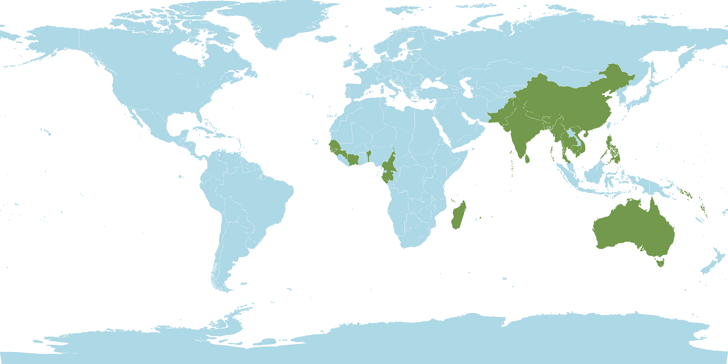 - World Distribution : Australia, Bangladesh, Bhutan, Cambodia, China, India, Jawa, Lakshadweep Islands, Lesser Sunda Islands, Maldives, Myanmar, Nepal, Pakistan, Philippines, Sri Lanka, Sulawesi, Thailand, Vietnam, Andaman and Nicobar Islands, Benin, Cameroon, Caroline Islands, Comoros, Gabon, Guinea, Guinea-Bissau, Ivory Coast, Leeward Islands, Madagascar, Mauritius, Réunion, Senegal, Solomon Islands, Trinidad-Tobago, Vanuatu, Windward Islands