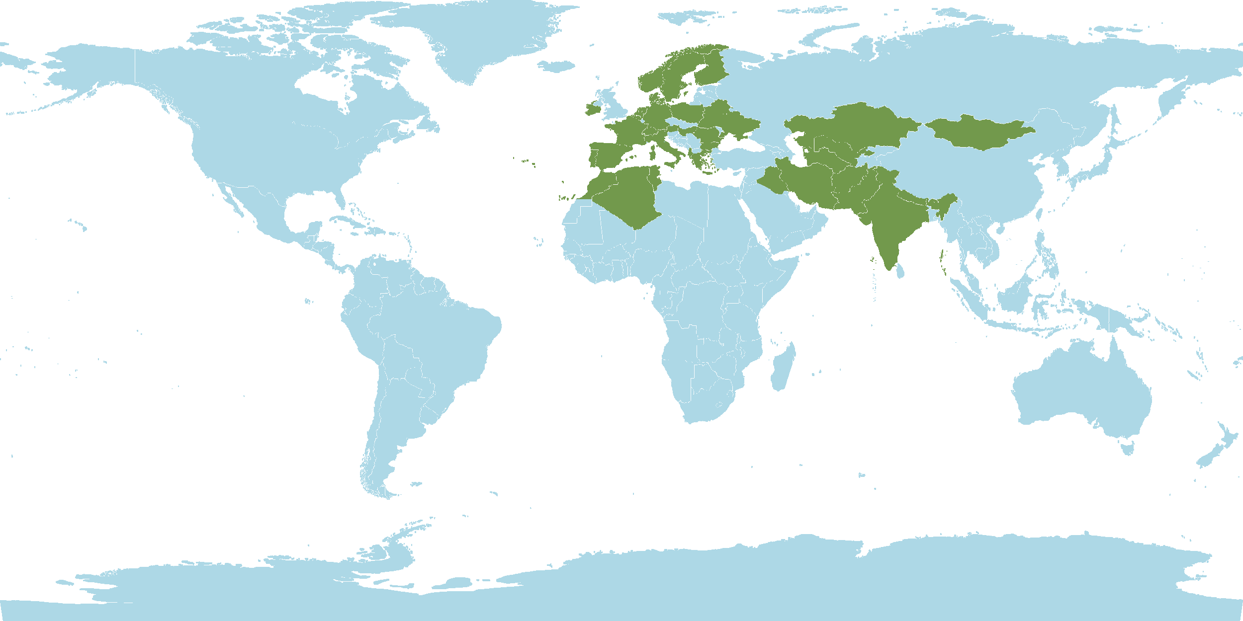 - World Distribution : Afghanistan, Albania, Algeria, Altay, Austria, Azores, Baltic States, Belarus, Belgium, Bhutan, Bulgaria, Buryatiya, Canary Islands, Central European Russia, Corse, Czechoslovakia, Denmark, East European Russia, Finland, France, Føroyar, Germany, Great Britain, Greece, Hungary, India, Iran, Iraq, Ireland, Irkutsk, Italy, Kazakhstan, Kirgizstan, Krasnoyarsk, Krym, Madeira, Mongolia, Morocco, Nepal, Netherlands, North Caucasus, North European Russia, Northwest European Russia, Norway, Pakistan, Poland, Portugal, Romania, Sardegna, Sicilia, South European Russia, Spain, Sweden, Switzerland, Tadzhikistan, Transcaucasus, Tunisia, Turkey-in-Europe, Turkmenistan, Tuva, Ukraine, Uzbekistan, West Siberia, Xinjiang, Yugoslavia