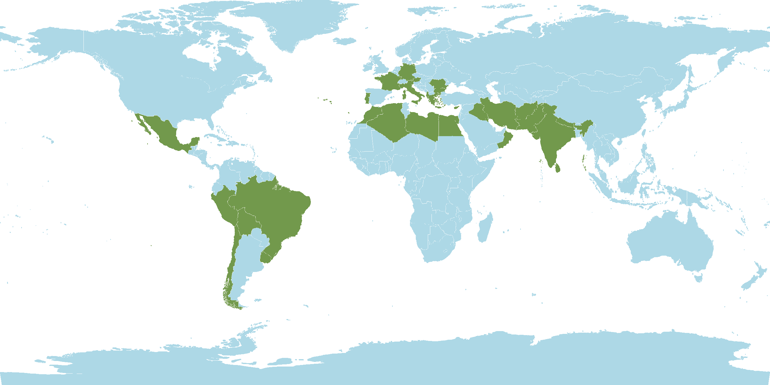 - World Distribution : Mediterranean to Central Asia and West Himalaya and Argentina, Argentina South, Arizona, Austria, Azores, Bolivia, Brazil, California, Canary Is., Cape Provinces, Chile, Czechoslovakia, Germany, Hawaii, Juan Fernández Is., Krym, Madeira, Massachusetts, Mexico, Montana, Nevada, New Mexico, New South Wales, New Zealand North, Norfolk Is., Oregon, Peru, South Australia, Sri Lanka, Tasmania, Uruguay, Victoria, Washington, Western Australia