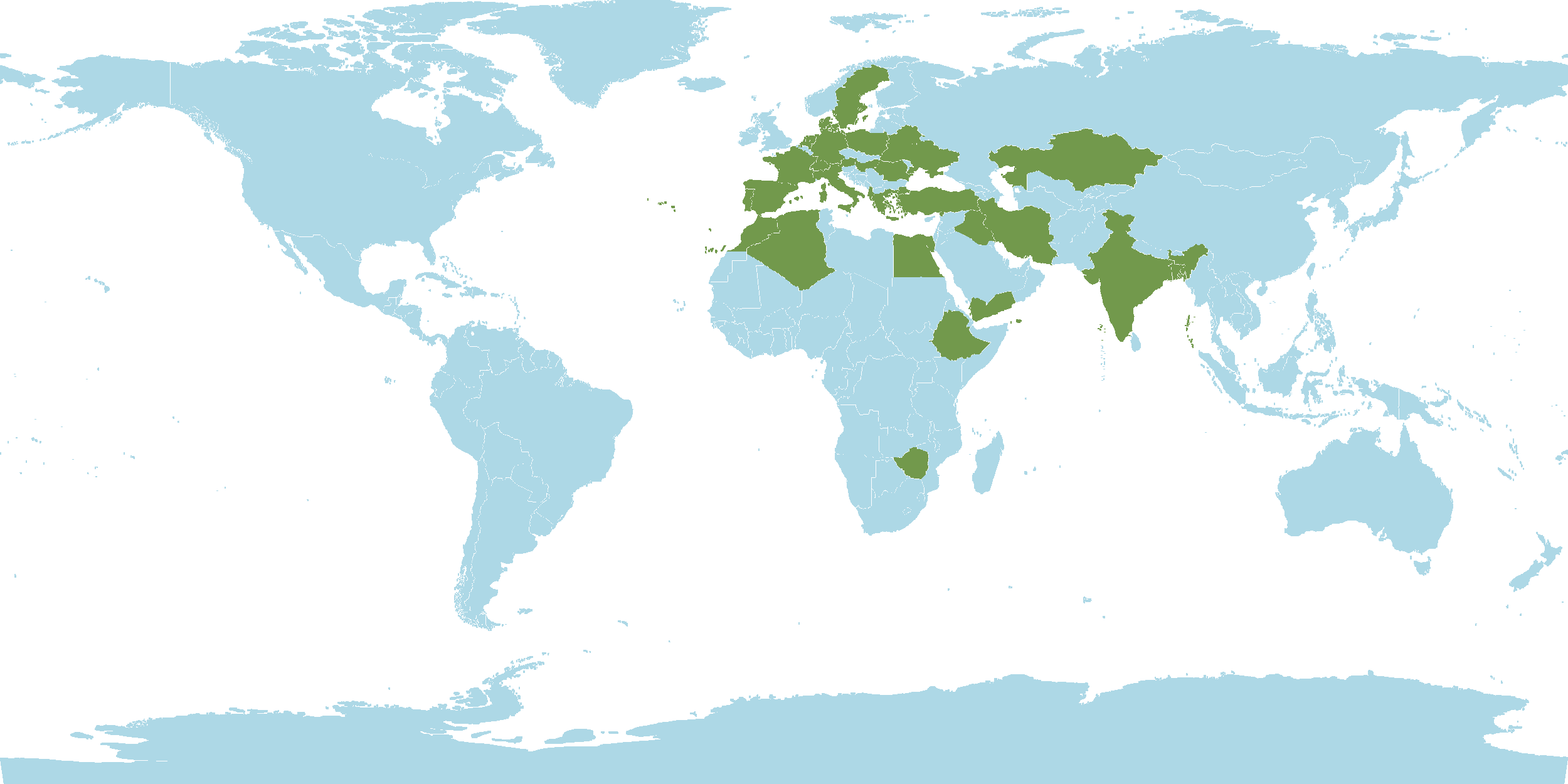 - World Distribution : Albania, Algeria, Austria, Bangladesh, Belarus, Central European Rus, Czechoslovakia, Denmark, East European Russia, Egypt, Ethiopia, France, Germany, Great Britain, Greece, Hungary, India, Iran, Iraq, Italy, Kazakhstan, Krym, Lebanon-Syria, Morocco, Netherlands, North Caucasus, North European Russi, Northwest European R, Palestine, Poland, Portugal, Romania, Sardegna, South European Russi, Spain, Sweden, Switzerland, Transcaucasus, Ukraine, West Himalaya, Yemen, Yugoslavia, Zimbabwe