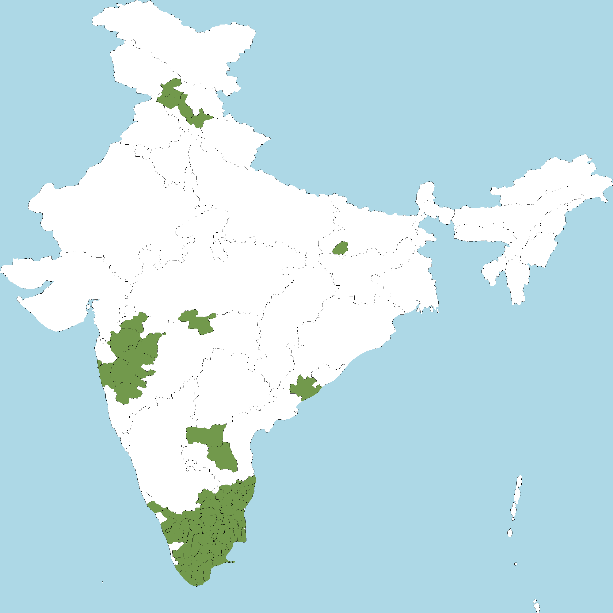 - Kerala : Kannur district, Wayanad district, Malappuram district, Palakkad district, Thrissur district, Idukki district, Kottayam district, Pathanamthitta district, Kollam district, Thiruvananthapuram district