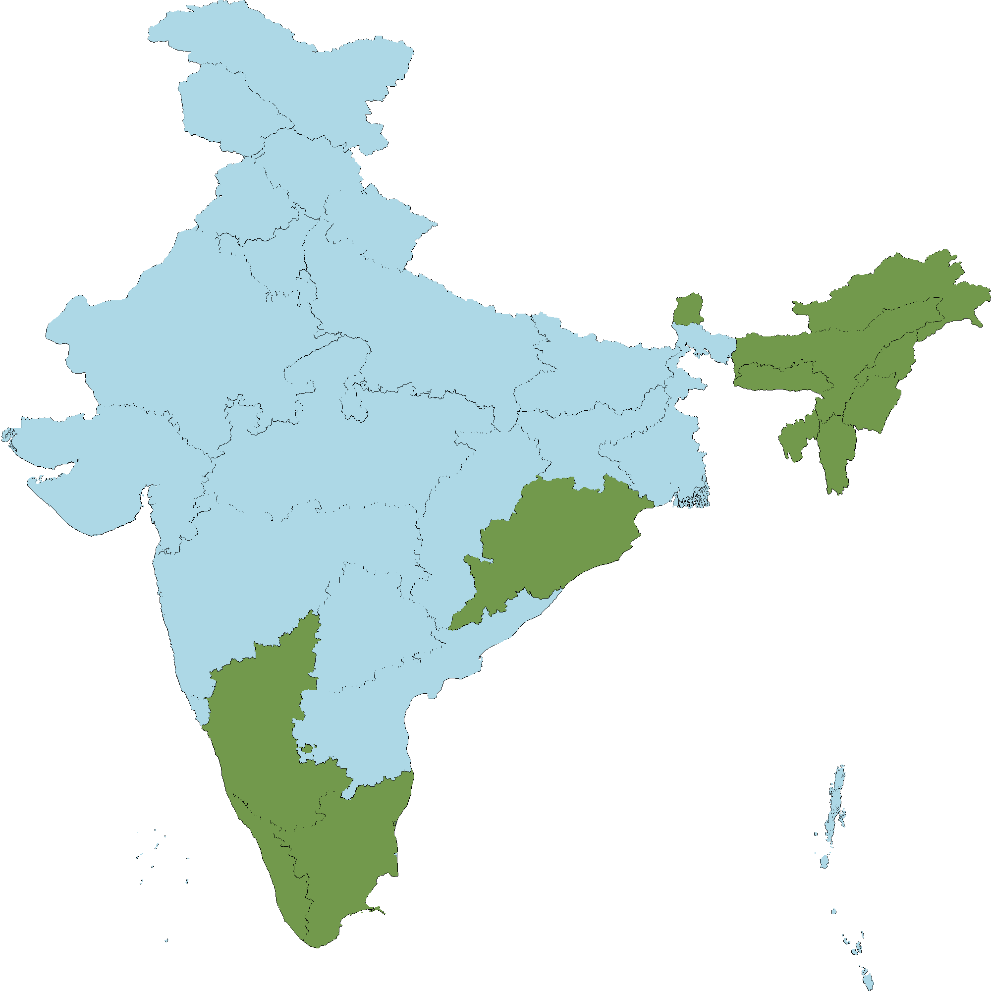 - Tamil Nadu : Coimbatore district, Kanyakumari district, Madurai district, The Nilgiri district, Tiruchirapalli district, Tirunelveli district, Dindigul district, Theni district