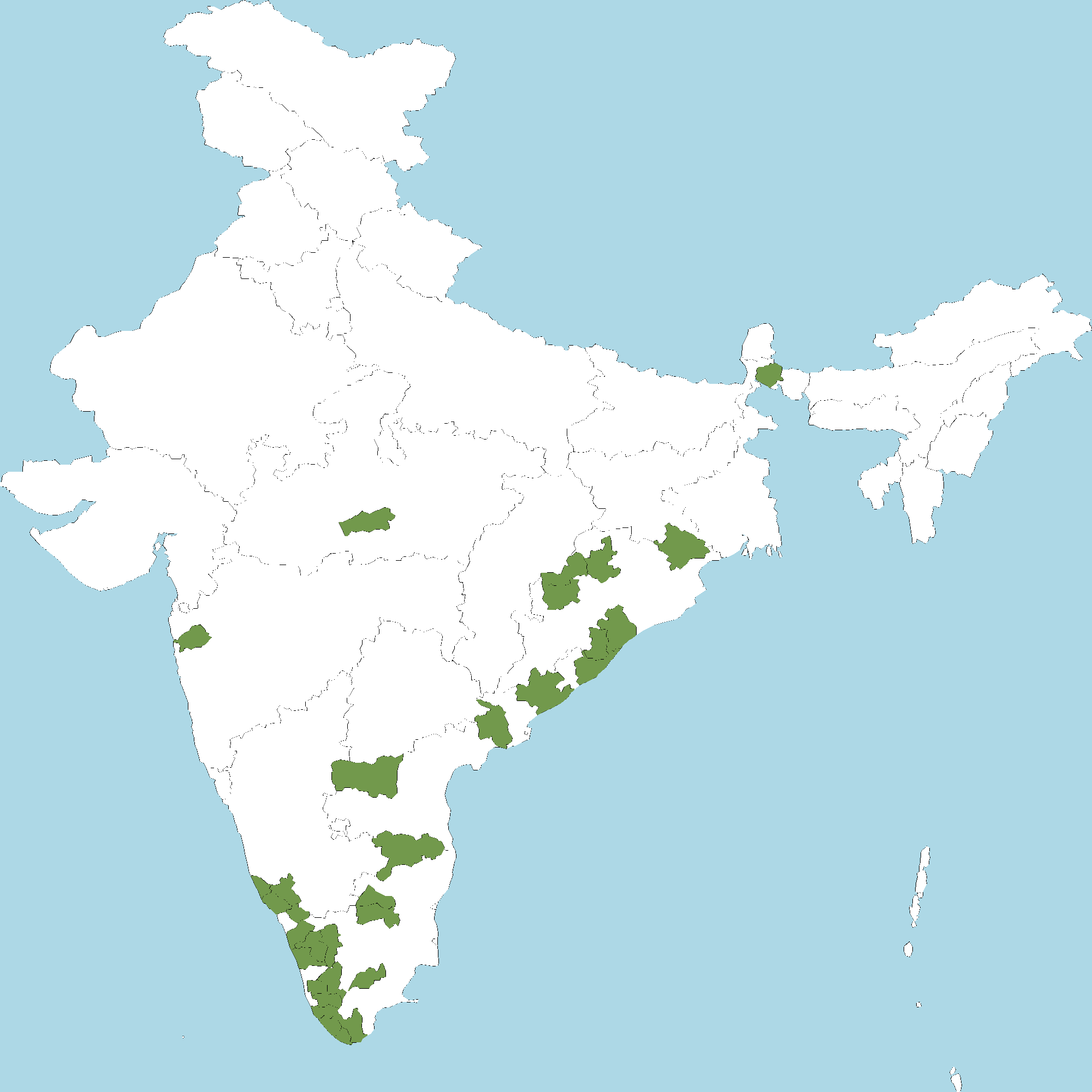 - Kerala : Kasaragod district, Kannur district, Wayanad district, Malappuram district, Palakkad district, Thrissur district, Idukki district, Kottayam district, Pathanamthitta district, Kollam district, Thiruvananthapuram district