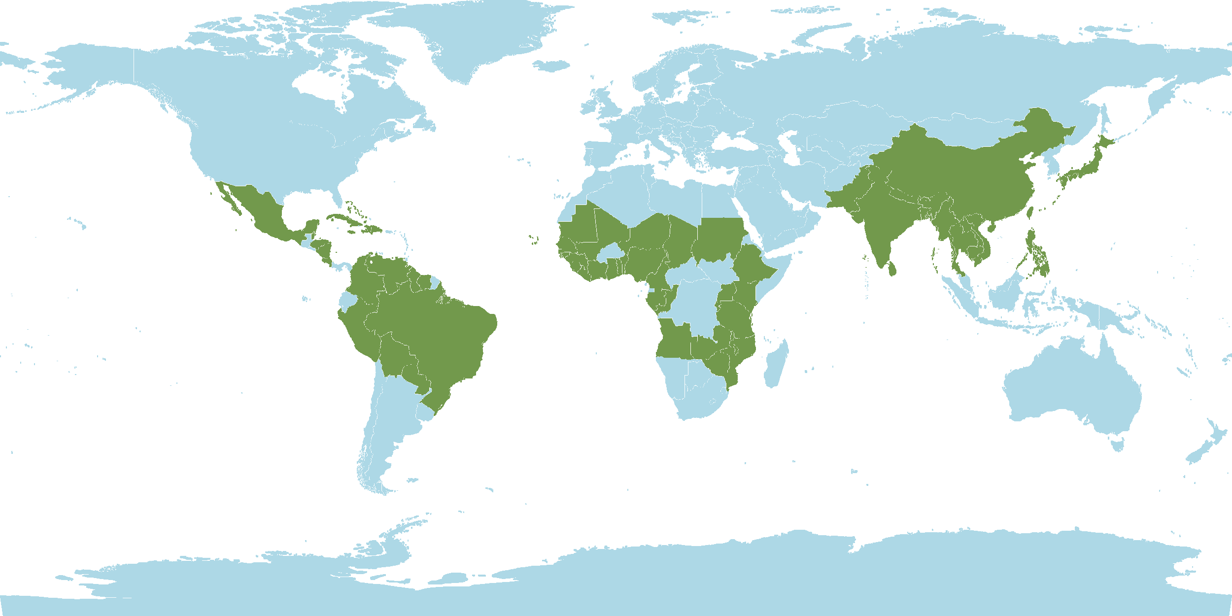 - World Distribution : Andaman and Nicobar Islands, Angola, Bahamas, Bangladesh, Belize, Benin, Bhutan, Bolivia, Brazil, Burkina, Burundi, Cambodia, Cameroon, Cape Verde, Caroline Islands, Central African Repu, Central American Pac, Chad, China, Colombia, Congo, Costa Rica, Cuba, Dominican Republic, Ethiopia, French Guiana, Gabon, Gambia, Ghana, Guinea, Guinea-Bissau, Gulf of Guinea Islands, Guyana, Hainan, Haiti, Honduras, India, Ivory Coast, Jamaica, Japan, Jawa, Kenya, Laos, Leeward Islands, Liberia, Malawi, Malaya, Mali, Marianas, Mauritania, Mexico, Mozambique, Myanmar, Nansei-shoto, Nepal, Nicaragua, Niger, Nigeria, Pakistan, Panamá, Paraguay, Peru, Philippines, Puerto Rico, Rwanda, Senegal, Sierra Leone, Sri Lanka, Sudan, Suriname, Taiwan, Tanzania, Thailand, Tibet, Togo, Trinidad-Tobago, Uganda, Venezuela, Vietnam, Windward Islands, Zambia, Zaïre, Zimbabwe