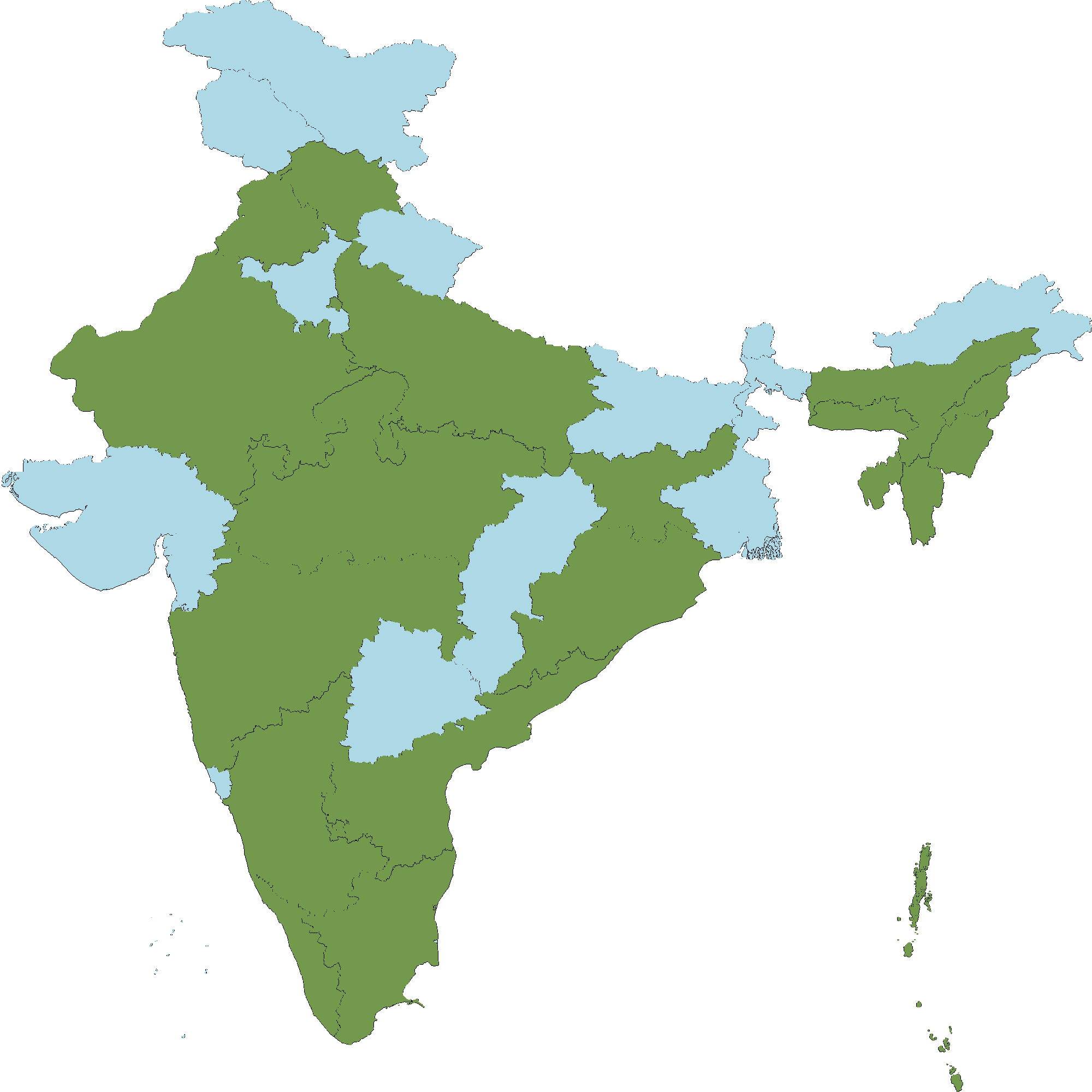 Andhra Pradesh : Throughout  Andhra Pradesh  Karnataka : All districts of Karnataka  Kerala : All districts of Kerala  Maharashtra : All districts of Maharashtra  Odisha : Throughout Odisha  Tamil Nadu : All districts of Tamil Nadu  Jharkhand :   Madhya Pradesh : Madhya Pradesh  Himachal Pradesh : Himachal Pradesh  Meghalaya : Meghalaya  Assam : Assam  Nagaland : Nagaland  Delhi : Delhi  Uttar Pradesh : Uttar Pradesh  Punjab : Punjab  Rajasthan : Jaisalmer district, Barmer district, Bikaner district, Jodhpur district  Mizoram : Mizoram  Andaman and Nicobar Islands : Port Blair taluk,Rose Island  Manipur : Manipur  Tripura : Tripura