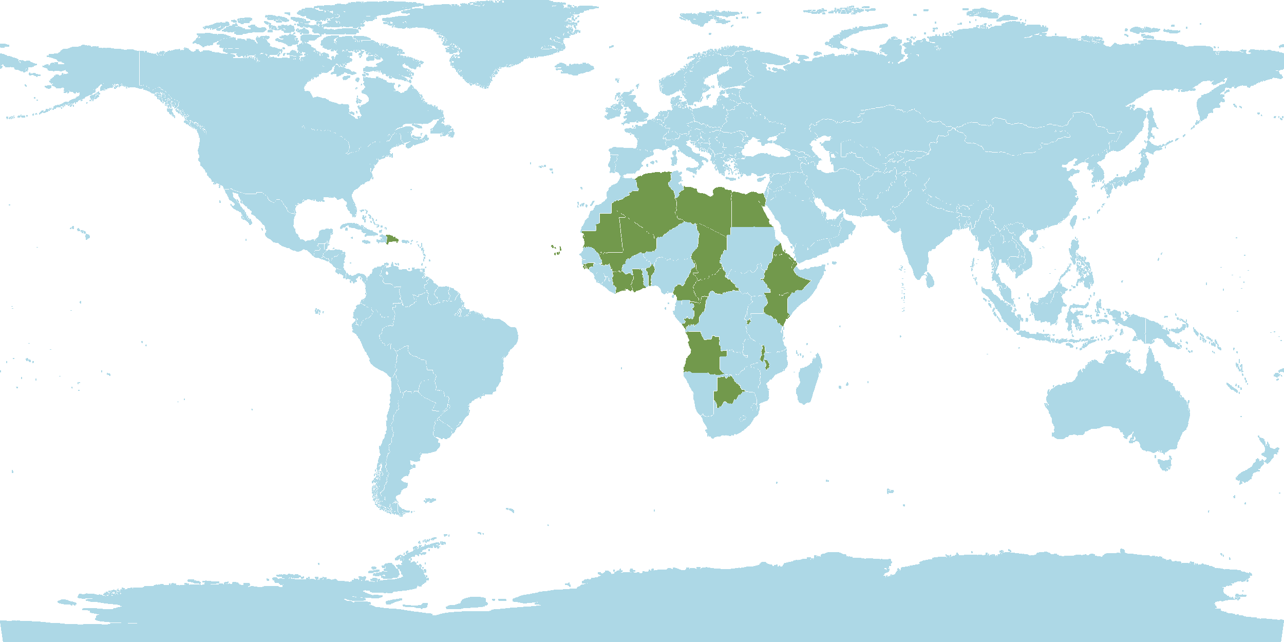 - Native : Algeria, Angola, Benin, Botswana, Burkina, Burundi, Cameroon, Caprivi Strip, Central African Republic, Chad, Congo, Djibouti, Egypt, Eritrea, Ethiopia, Gambia, Ghana, Guinea-Bissau, Ivory Coast, Kenya, Lebanon-Syria, Libya, Malawi, Mali, Mauritania, Moroc