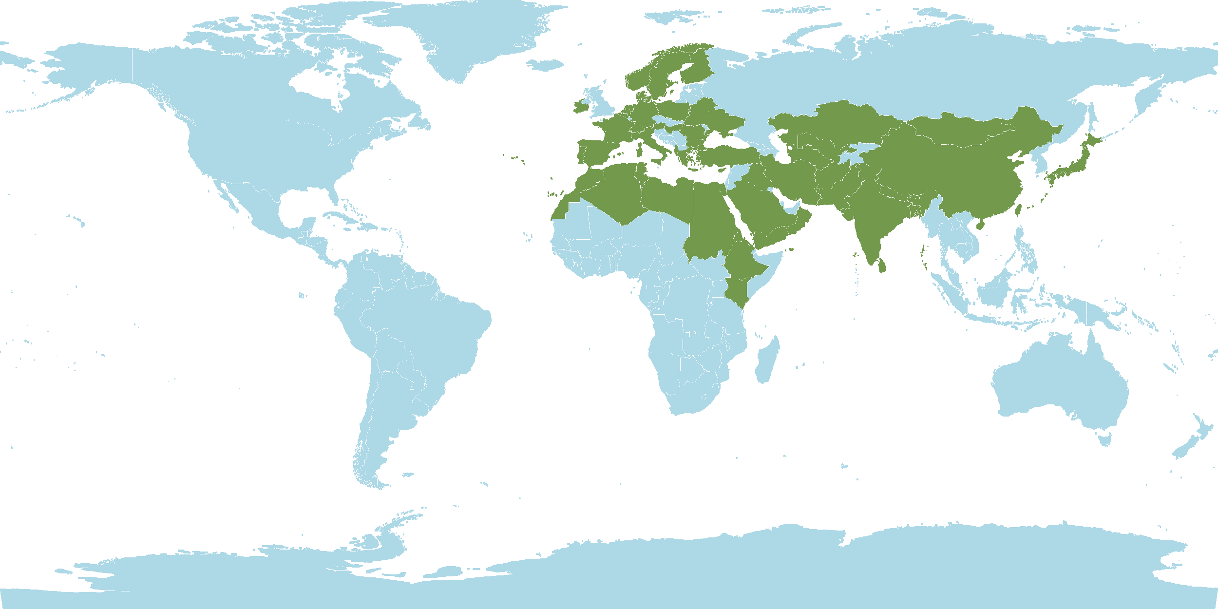 - World Distribution : Afghanistan, Albania, Algeria, Altay, Austria, Azores, Baleares, Baltic States, Bangladesh, Belarus, Belgium, Bhutan, Bulgaria, Buryatiya, Canary Islands, Central European Russia, China, Corse, Cyprus, Czechoslovakia, Denmark, East Aegean Islands, East European Russia, Egypt, Eritrea, Ethiopia, Finland, France, Germany, Great Britain, Greece, Gulf States, Hungary, India, Iran, Iraq, Ireland, Irkutsk, Italy, Japan, Kamchatka, Kazakhstan, Kenya, Khabarovsk, Kirgizstan, Korea, Krasnoyarsk, Kriti, Krym, Kuril Islands, Lebanon-Syria, Libya, Madeira, Magadan, Mongolia, Morocco, Nansei-shoto, Nepal, Netherlands, North Caucasus, North European Russia, Northwest European Russia, Norway, Oman, Pakistan, Palestine, Poland, Portugal, Primorye, Romania, Sakhalin, Sardegna, Saudi Arabia, Sicilia, Sinai, South European Russia, Spain, Sri Lanka, Sudan, Sweden, Switzerland, Tadzhikistan, Taiwan, Tibet, Transcaucasus, Tunisia, Turkey, Turkey-in-Europe, Turkmenistan, Tuva, Ukraine, Uzbekistan, West Siberia, Western Sahara, Xinjiang, Yakutskiya, Yemen, Yugoslavia