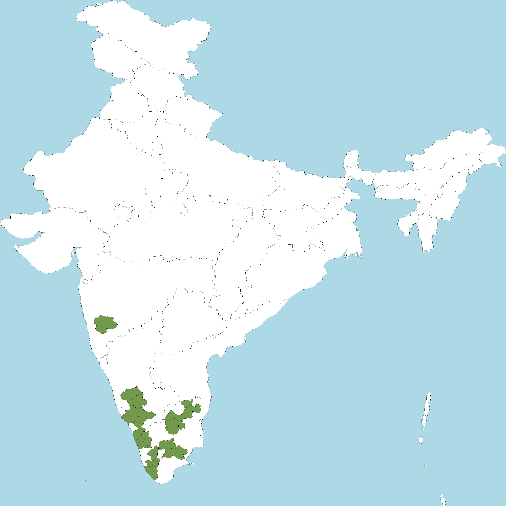 - Kerala : Kannur district, Wayanad district, Malappuram district, Palakkad district, Thrissur district, Idukki district, Pathanamthitta district, Kollam district, Thiruvananthapuram district