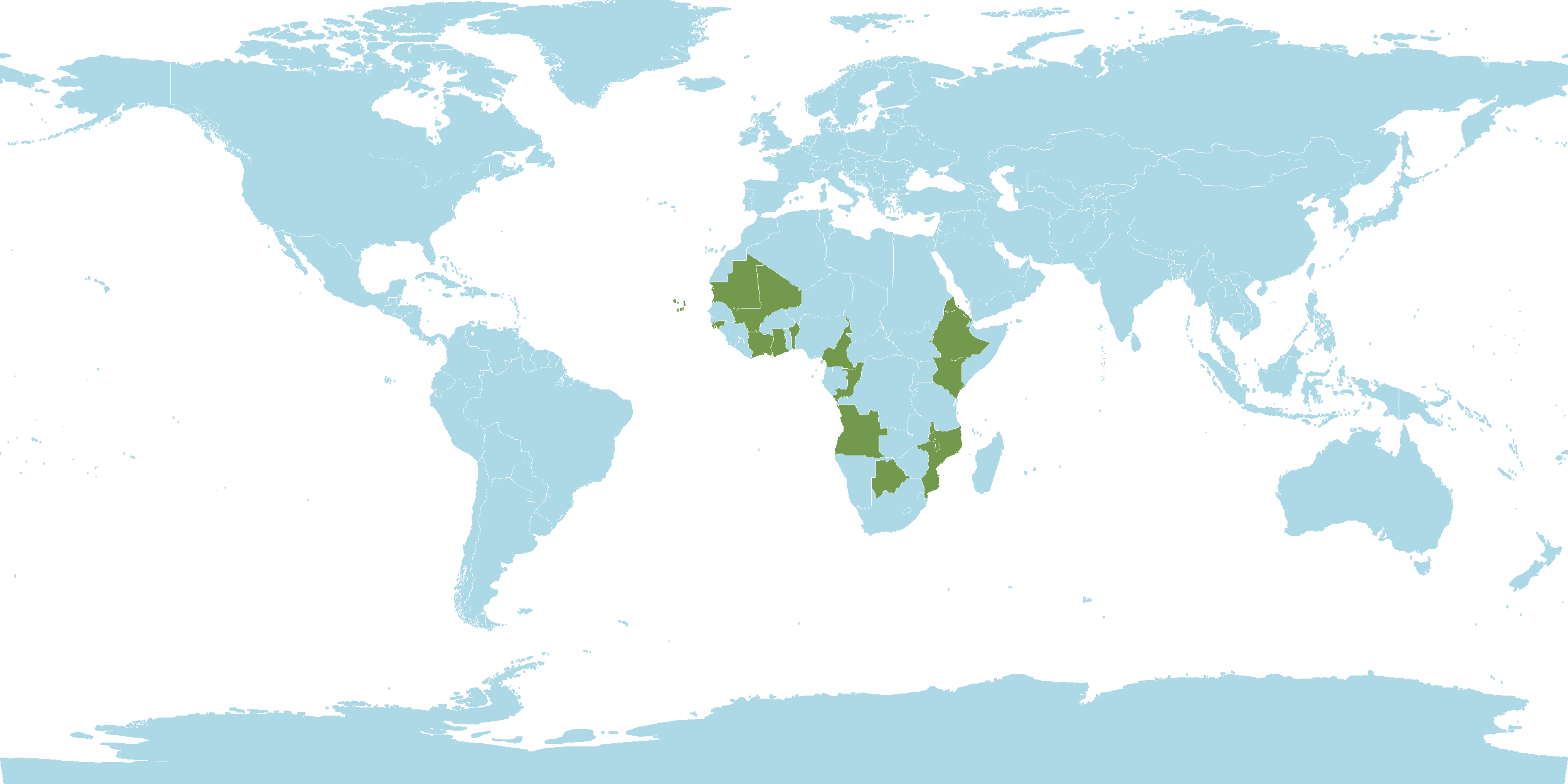 - Native : Angola, Benin, Botswana, Cameroon, Cape Provinces, Cape Verde, Caprivi Strip, Central African Repu, Congo, Eritrea, Ethiopia, Gambia, Ghana, Guinea-Bissau, Gulf of Guinea Islands, Ivory Coast, Kenya, KwaZulu-Natal, Malawi, Mali, Mauritania, Mozambique, Na