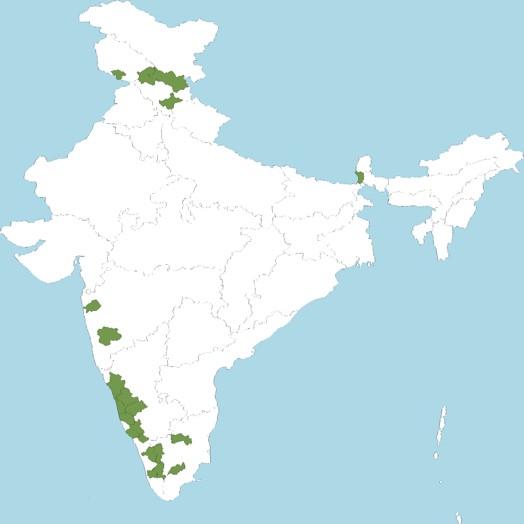 - Karnataka : Chikkamagaluru district, Dakshina Kannada district, HAN, Uttara Kannada district, Kodagu (Coorg) district, Shivamogga district, Udupi district