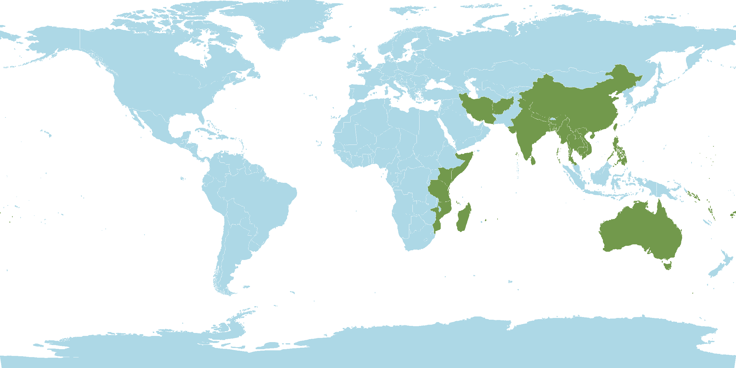 - Native : Afghanistan, Andaman Islands, Australia, Bangladesh, Bismarck Archipelago, Borneo, Cambodia, Caroline Islands, China, Comoros, Cook Islands, Fiji, Gilbert Islands, Hainan, India, Iran, Jawa, Kenya, KwaZulu-Natal, Laos, Lesser Sunda Islands, Line Islands,