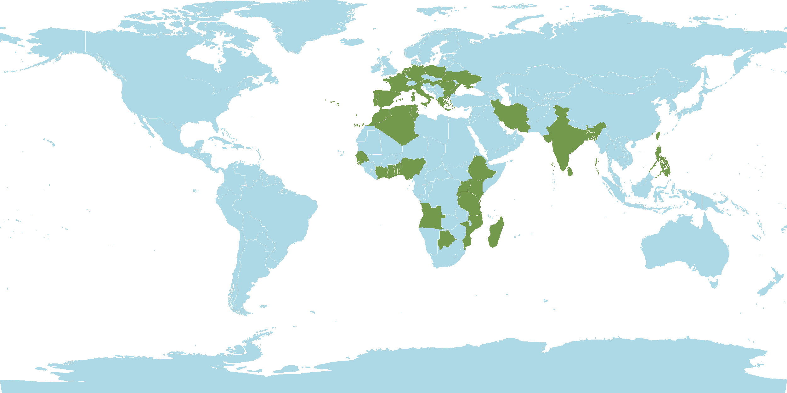 - World Distribution : Algeria, Angola, Austria, Baltic States, Bangladesh, Belgium, Benin, Botswana, Bulgaria, Burundi, Canary Islands, Cape Provinces, Central European Rus, Corse, Czechoslovakia, East European Russia, Ethiopia, France, Free State, Germany, Ghana, Great Britain, Greece, Guinea-Bissau, Hungary, India, Iran, Italy, Ivory Coast, Kenya, Korea, KwaZulu-Natal, Lebanon-Syria, Madagascar, Morocco, Mozambique, Netherlands, Nigeria, North Caucasus, Northern Provinces, Philippines, Poland, Portugal, Romania, Rwanda, Senegal, Sicilia, South European Russi, Spain, Sri Lanka, Taiwan, Tanzania, Togo, Transcaucasus, Tunisia, Uganda, Ukraine, Yugoslavia, Zaïre