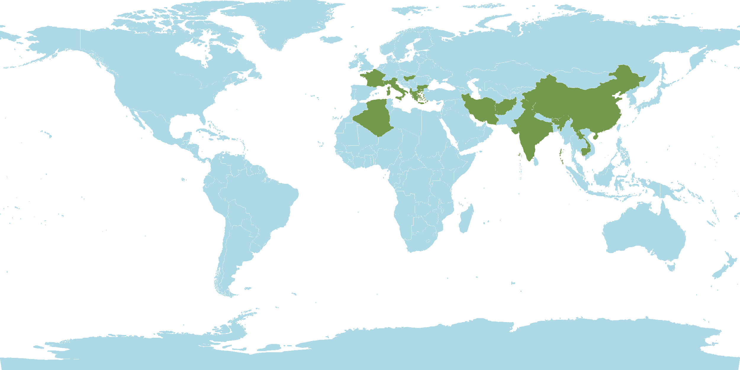 - Native : Afghanistan, Albania, Algeria, Baleares, Bhutan, Bulgaria, Cambodia, China, Corse, Czechoslovakia, East Aegean Islands, East European Russia, France, Greece, Hainan, Hungary, India, Inner Mongolia, Iran, Italy, Kriti, Krym, Laos, Lebanon-Syria, Manchuria,
