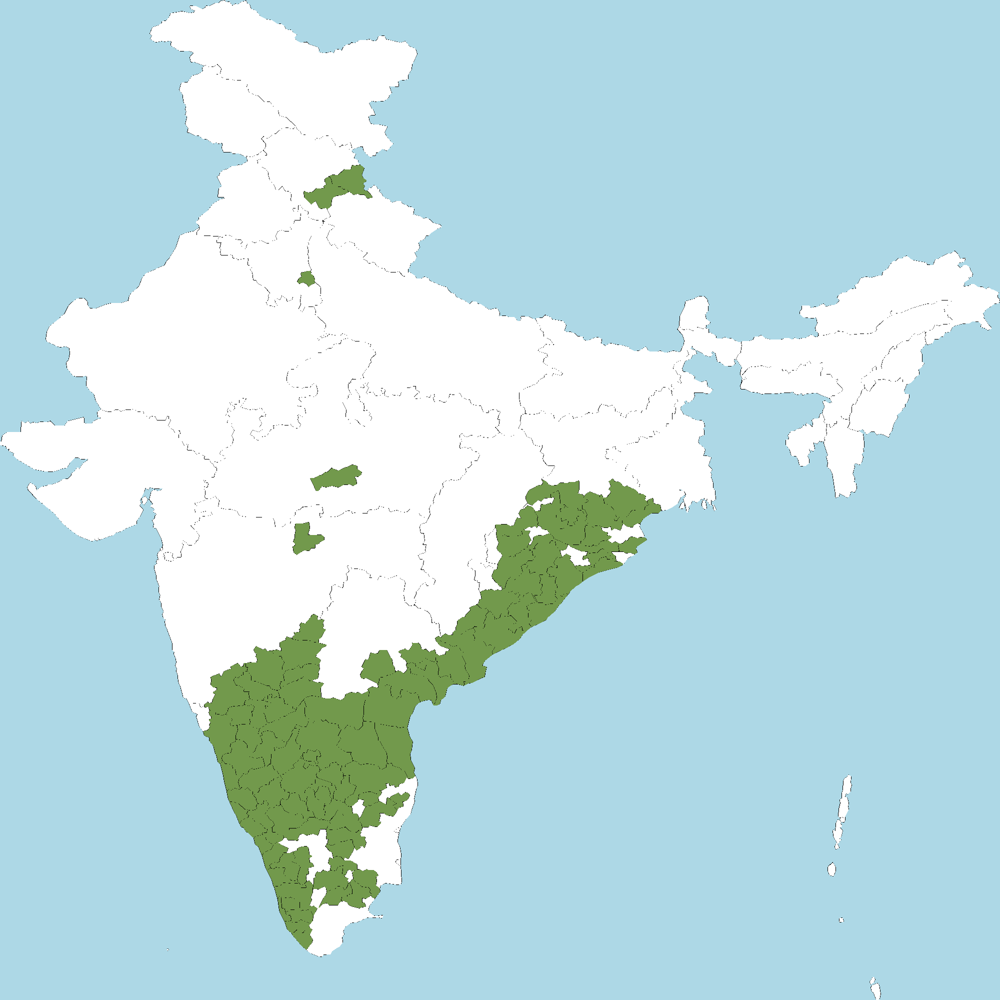 - Andhra Pradesh : Anantapur district, Chittoor district, Y.S.R. Kadapa district, East Godavari district, Guntur district, Krishna district, Kurnool district, S.P.S. Nellore district, Prakasam district, Srikakulam district, Visakhapatnam district, Vizianagaram district, West Godavari district