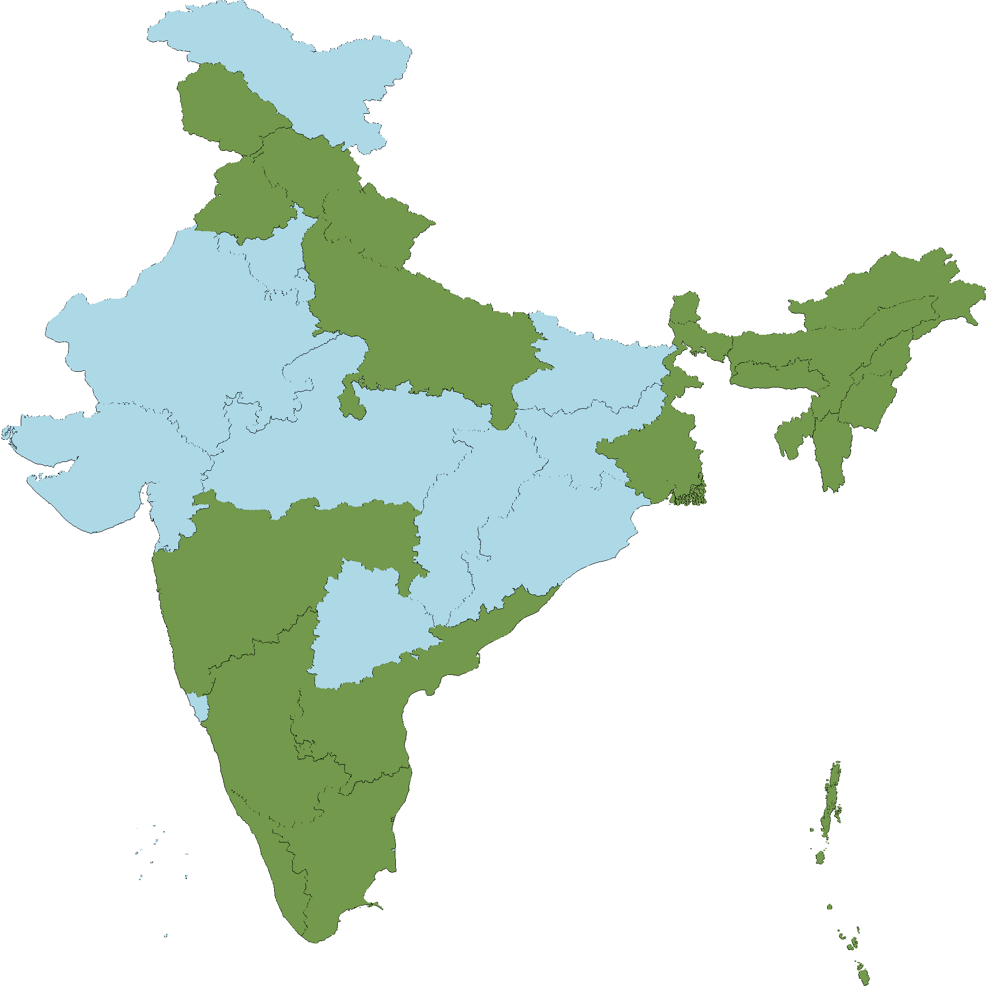 Andhra Pradesh : Throughout Eastern Ghats  Karnataka : Kolar district  Kerala : All districts of Kerala  Maharashtra : Akola district  Tamil Nadu : All districts of Tamil Nadu  Uttarakhand : Uttarakhand  Sikkim : Sikkim  West Bengal : Bankura, Howrah, Murshidabad  Himachal Pradesh : Kinnaur district  Arunachal Pradesh : Arunachal Pradesh  Meghalaya : Meghalaya  Assam : Assam  Nagaland : Nagaland  Uttar Pradesh : Uttar Pradesh  Punjab : Punjab  Jammu and Kashmir : Jammu and Kashmir  Mizoram : Mizoram  Andaman and Nicobar Islands : Andaman Islands  Manipur : Manipur  Tripura : Tripura
