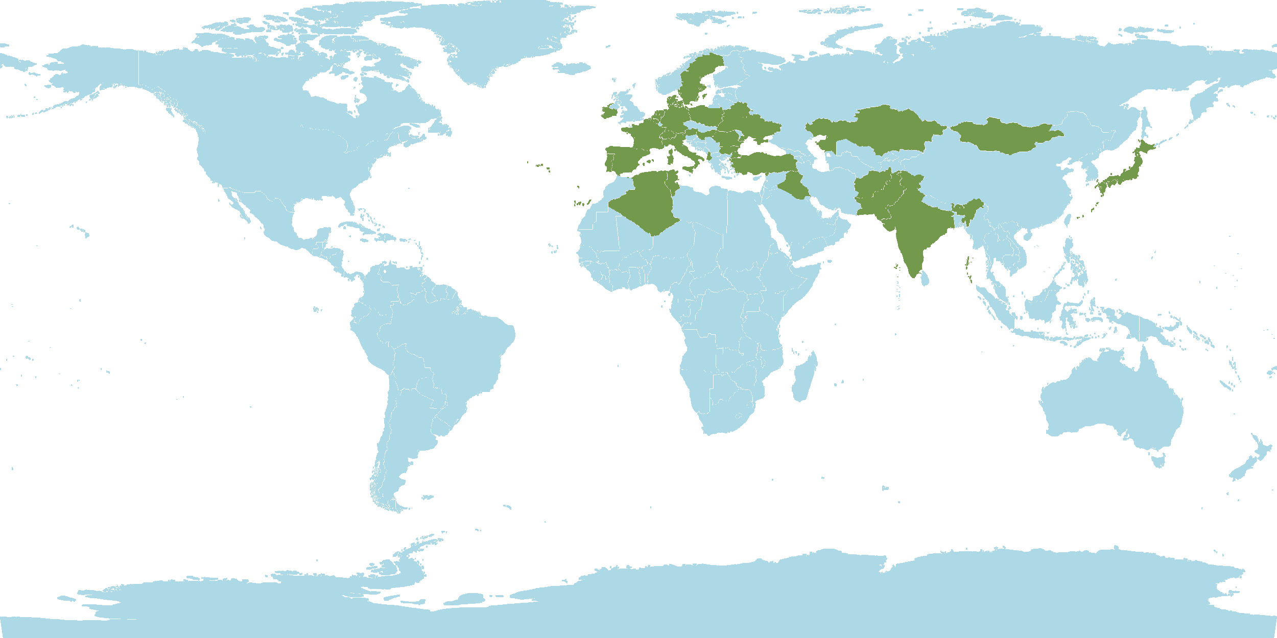 - World Distribution : Afghanistan, Albania, Algeria, Austria, Baltic States, Belarus, Belgium, Bhutan, Bulgaria, Central European Russia, Corse, Czechoslovakia, Denmark, East European Russia, France, Germany, Great Britain, Hungary, India, Inner Mongolia, Iraq, Ireland, Italy, Japan, Kazakhstan, Kirgizstan, Korea, Manchuria, Mongolia, Nansei-shoto, Netherlands, Northwest European Russia, Pakistan, Poland, Portugal, Romania, Sardegna, Sicilia, South European Russia, Spain, Sweden, Switzerland, Tadzhikistan, Tunisia, Turkey, Turkey-in-Europe, Ukraine, Xinjiang, Yugoslavia