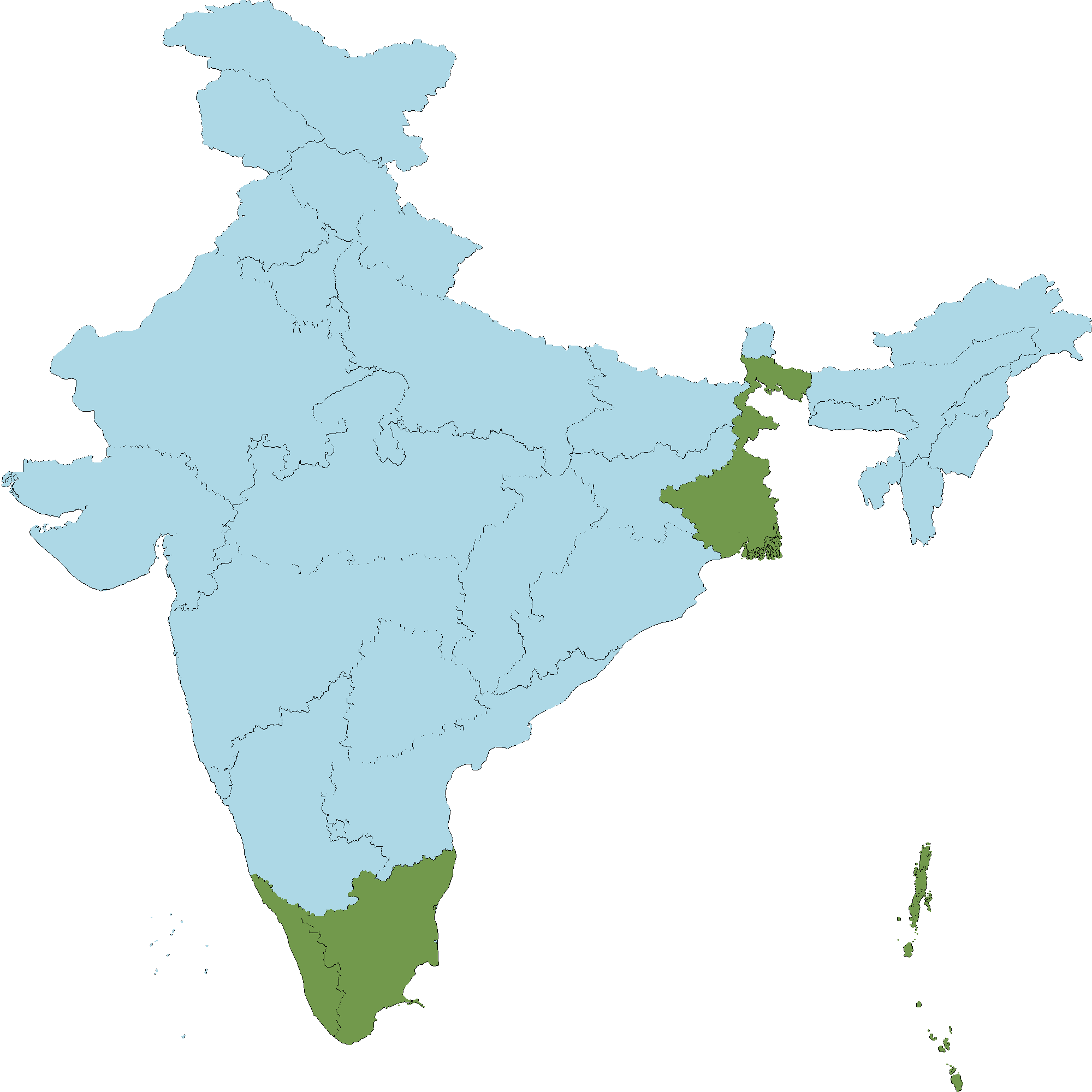 - Kerala : Kasaragod district, Kottayam district, Alappuzha district, Kollam district, Thiruvananthapuram district