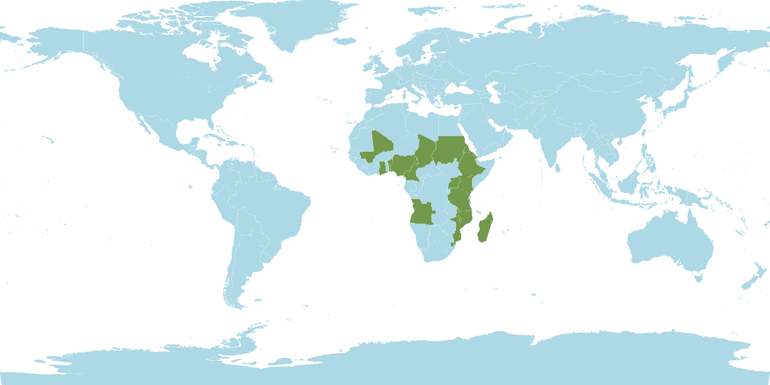 - World Distribution : Angola, Benin, Cameroon, Central African Repu, Chad, Comoros, Eritrea, Ethiopia, Ghana, Kenya, KwaZulu-Natal, Madagascar, Malawi, Mali, Mozambique, Nigeria, Northern Provinces, Sudan, Swaziland, Tanzania, Uganda, Zaïre