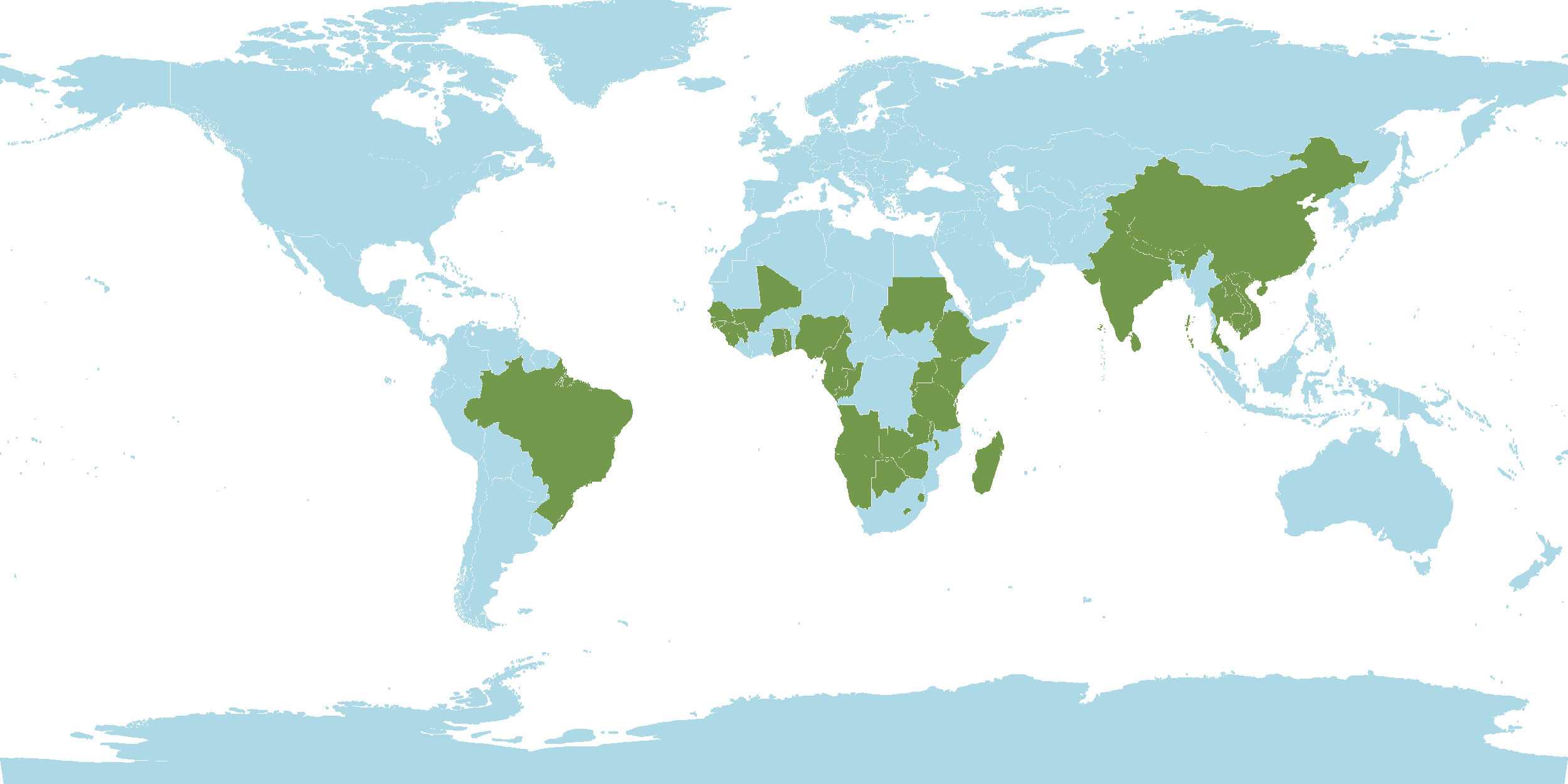 - World Distribution : Angola, Botswana, Brazil, Burundi, Cambodia, Cameroon, Cape Provinces, China, Congo, Bhutan, Equatorial Guinea, Ethiopia, Gabon, Ghana, Guinea, Guinea-Bissau, India, Jawa, Kenya, KwaZulu-Natal, Laos, Lesotho, Madagascar, Malawi, Malaya, Mali, Maluku, Namibia, Nepal, New Guinea, Nigeria, Northern Provinces, Rwanda, Senegal, Sierra Leone, Sri Lanka, Sudan, Sulawesi, Sumatera, Swaziland, Tanzania, Thailand, Togo, Uganda, Vietnam, Zambia, Zaïre, Zimbabwe