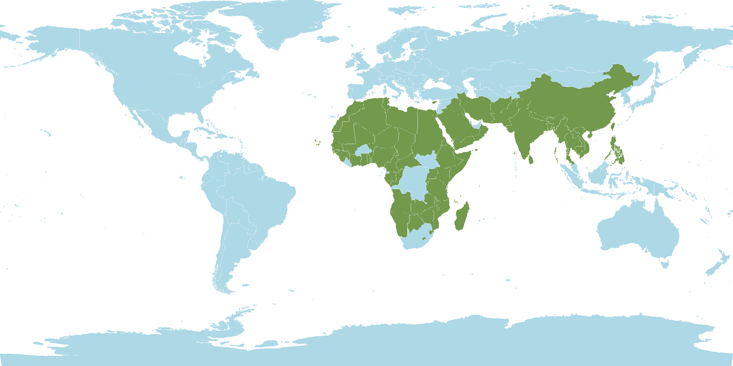 - World Distribution : Afghanistan, Algeria, Angola, Bangladesh, Benin, Bhutan, Borneo, Botswana, Burkina, Burundi, Cambodia, Cameroon, Canary Islands, Cape Provinces, Cape Verde, Central African Republic, Chad, China, Comoros, Congo, Cyprus, Djibouti, East Aegean Islands, Egypt, Eritrea, Ethiopia, Free State, Gabon, Gambia, Ghana, Guinea, Guinea-Bissau, Gulf of Guinea Islands, Gulf States, Hainan, India, Iran, Iraq, Ivory Coast, Jawa, Kenya, Kuwait, KwaZulu-Natal, Laos, Lebanon-Syria, Lesotho, Lesser Sunda Islands, Libya, Madagascar, Madeira, Malawi, Malaya, Mali, Maluku, Mauritania, Morocco, Mozambique, Myanmar, Namibia, Nansei-shoto, Nepal, New Guinea, Niger, Nigeria, Northern Provinces, Ogasawara-shoto, Oman, Pakistan, Palestine, Philippines, Rwanda, Saudi Arabia, Senegal, Seychelles, Sierra Leone, Sinai, Socotra, Somalia, South China Sea, Sri Lanka, Sudan, Sulawesi, Sumatera, Swaziland, Tadzhikistan, Taiwan, Tanzania, Thailand, Tibet, Togo, Tunisia, Uganda, Vietnam, Western Sahara, Xinjiang, Yemen, Zambia, Zaïre, Zimbabwe